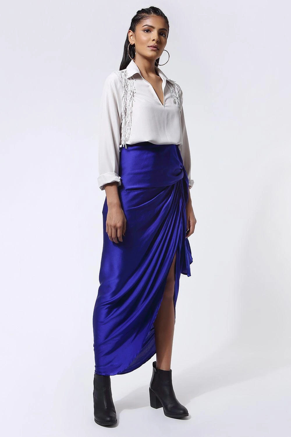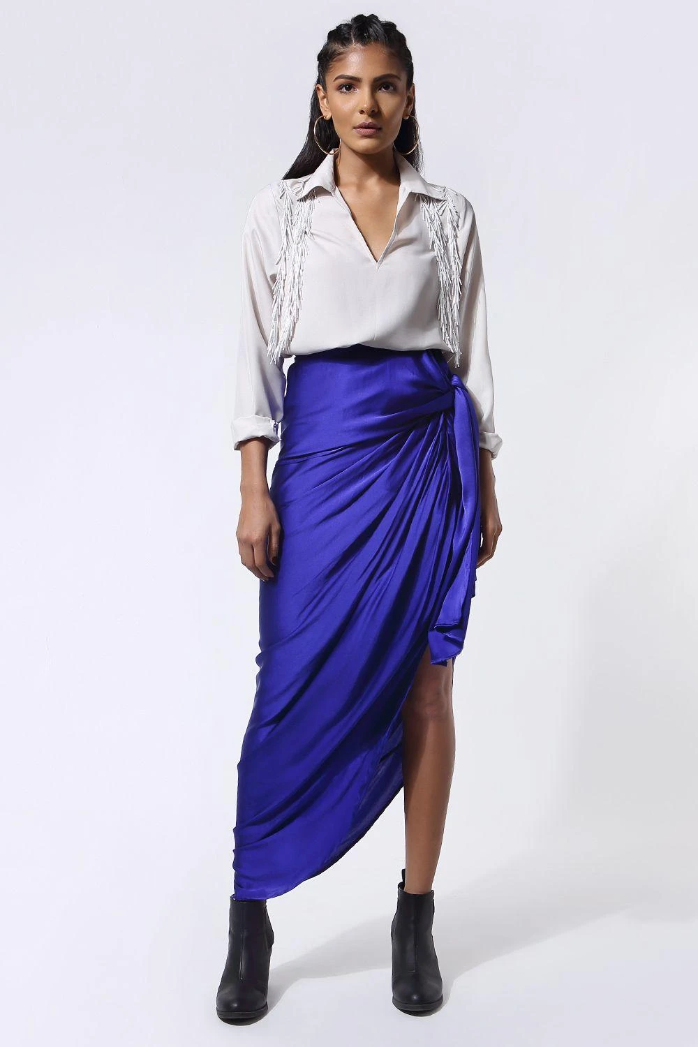 The side slit of this tie up skirt make it a fun choice for a club night with your girlfriends. With its stunning colour, it will look impactful with most blouses and shirts.