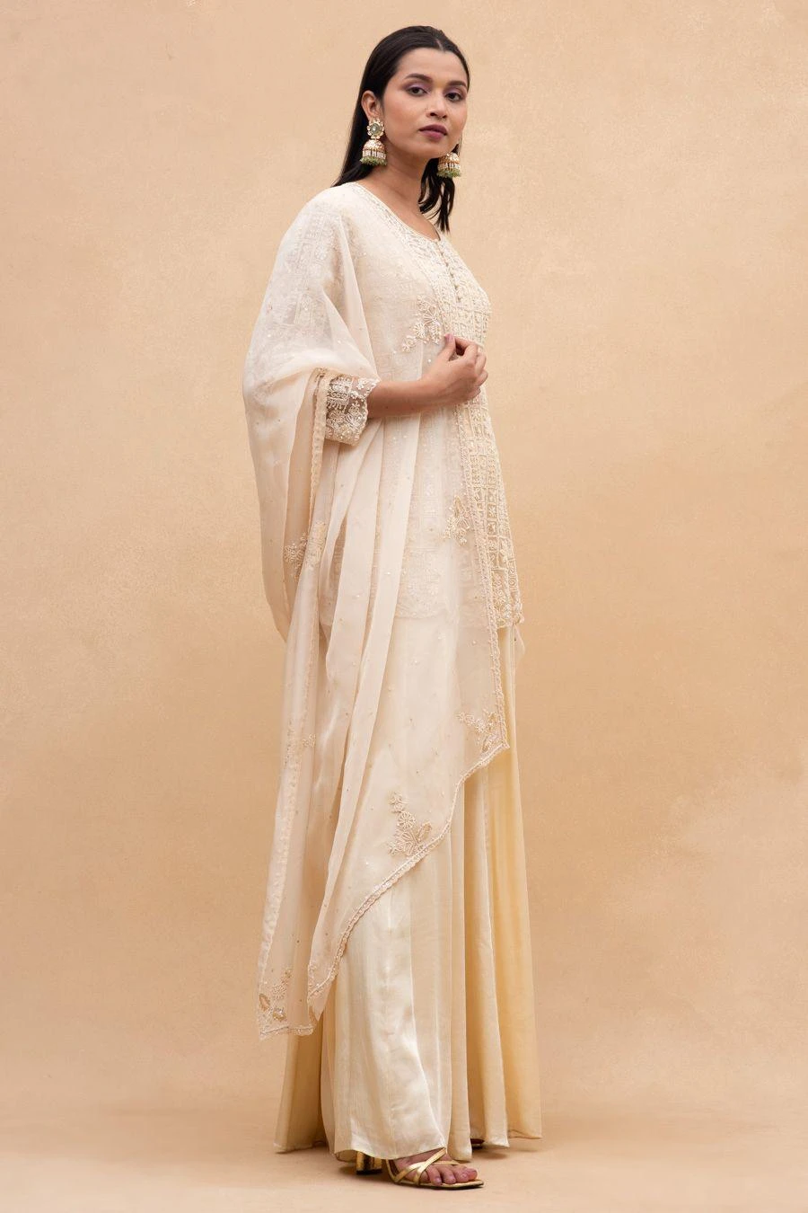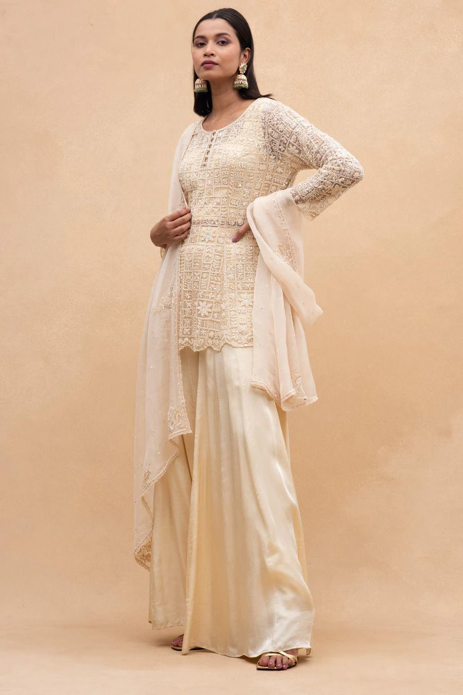 This sharara set will see you through all celebrations this wedding season. Crafted in satin organza, this set features a crystal embellished kurta, a sharara & dupatta. Style this comfortable silhouette with statement earrings to complete the look.