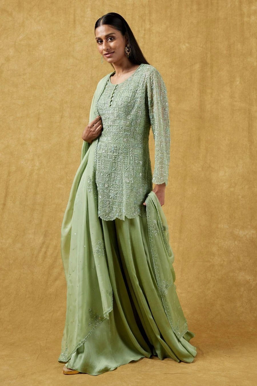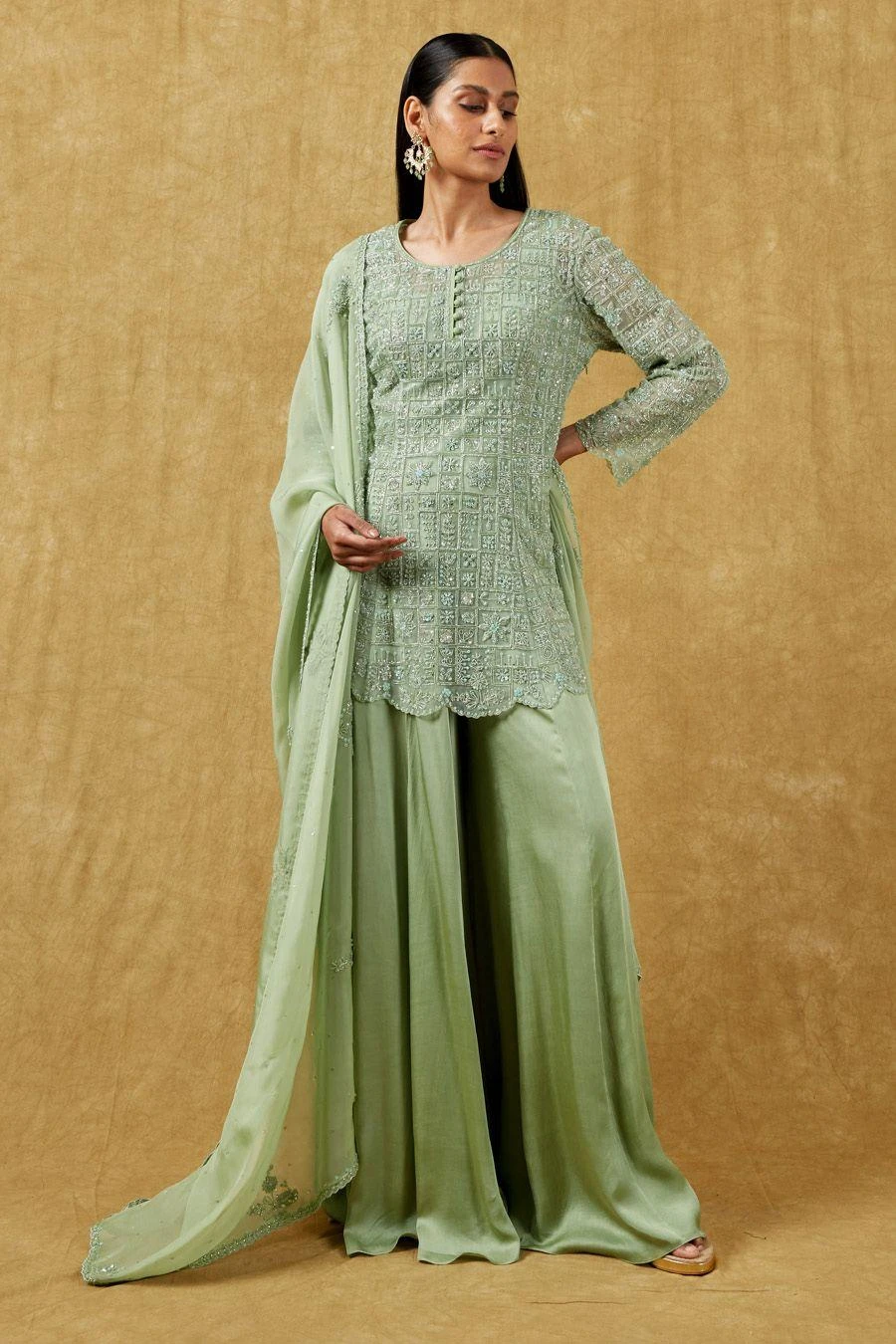 This sharara set will see you through all celebrations this wedding season. Crafted in satin organza, this set features a crystal embellished kurta, a sharara & dupatta. Style this comfortable silhouette with statement earrings to complete the look.