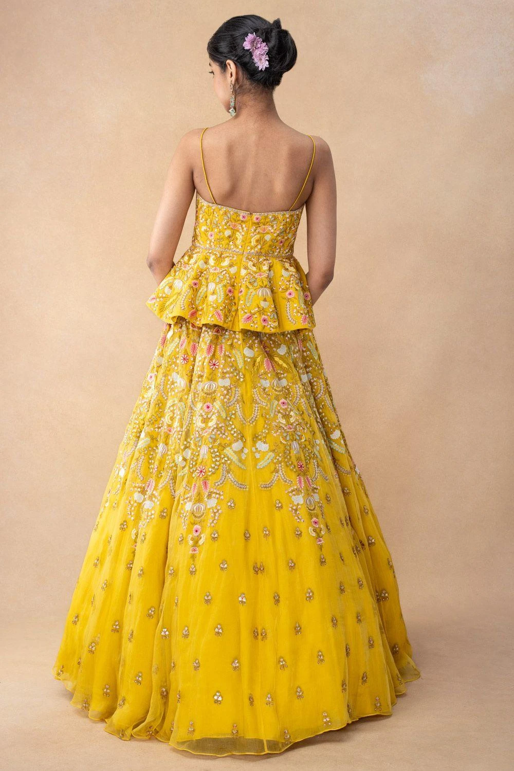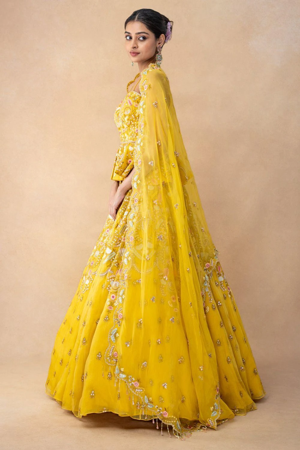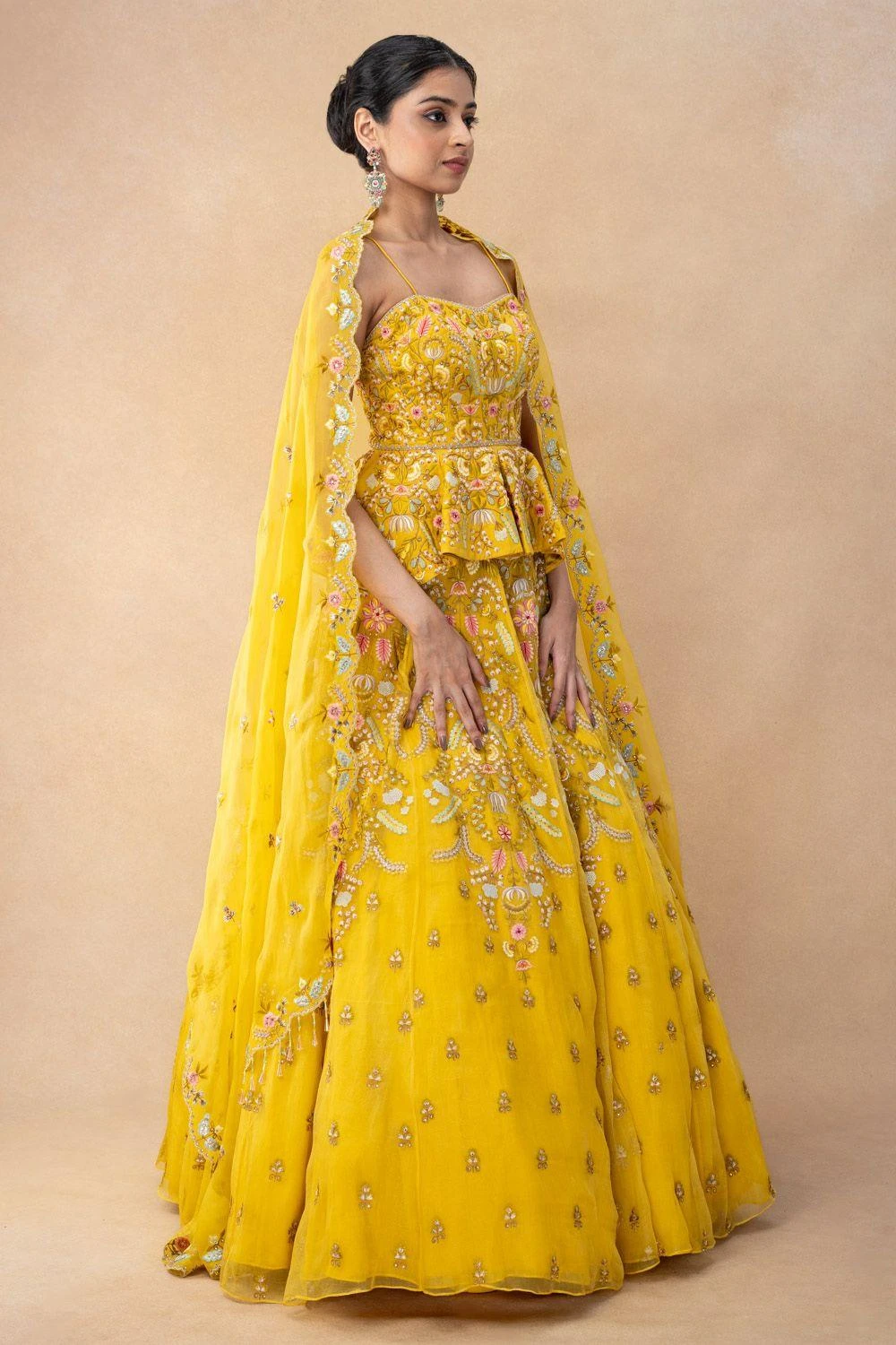 Experience the epitome of grace with this thread embellished lehenga set. Crafted in georgette, this set features a floral lehenga paired with a strappy peplum & a dupatta. Every detail exudes elegance, creating a timeless masterpiece.