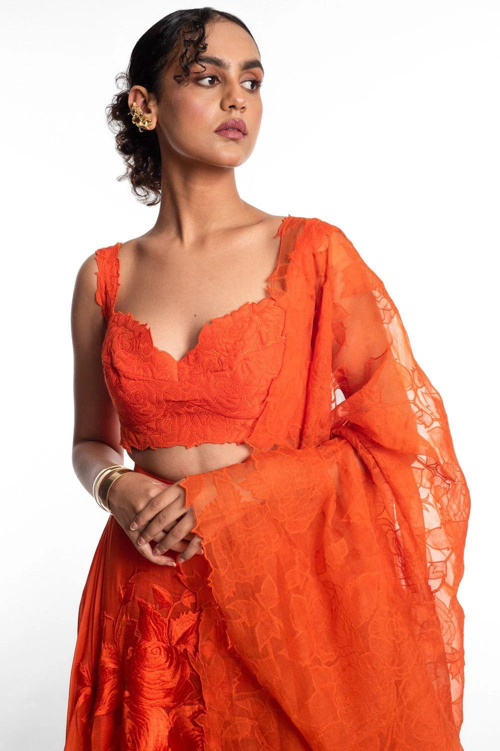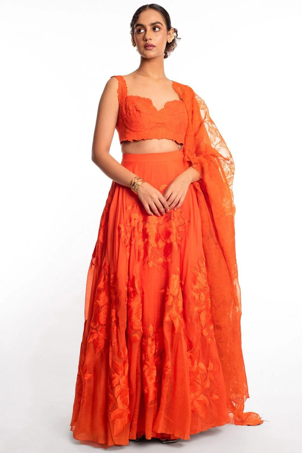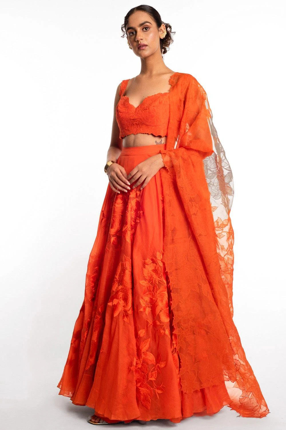 This lehenga set will see you through all pre wedding festivities. It features a quilted embroidered bralette paired with a resham embroidered dupatta & a lehenga. Style this set with a pair of statement earrings to complete the look.
