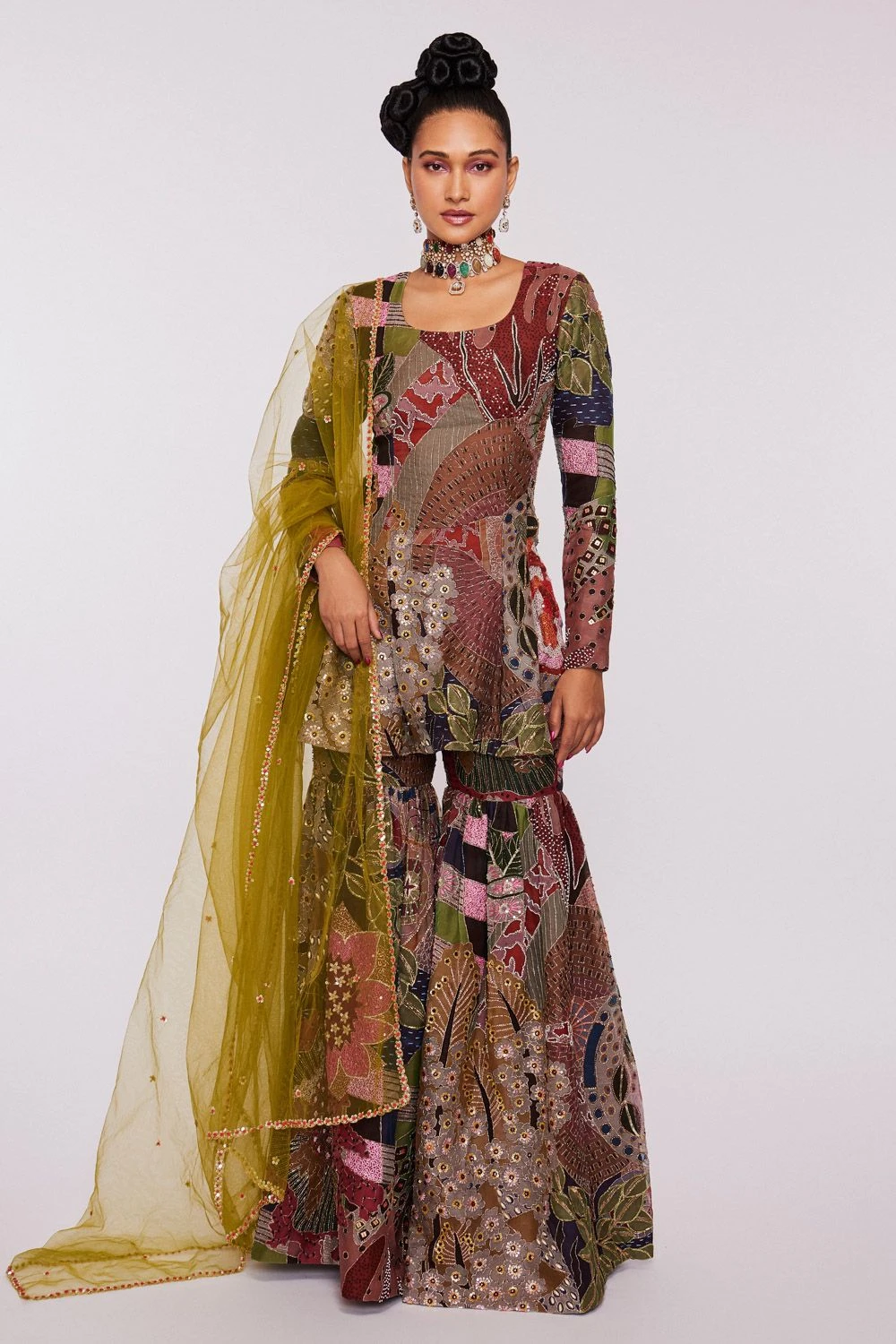 This midnight blue printed sharara set exudes high impact glamour which makes it perfect for your evening festivities. The kurta & sharara are made in abstract printed organza and highlighted with golden work. It comes along with an olive dupatta.