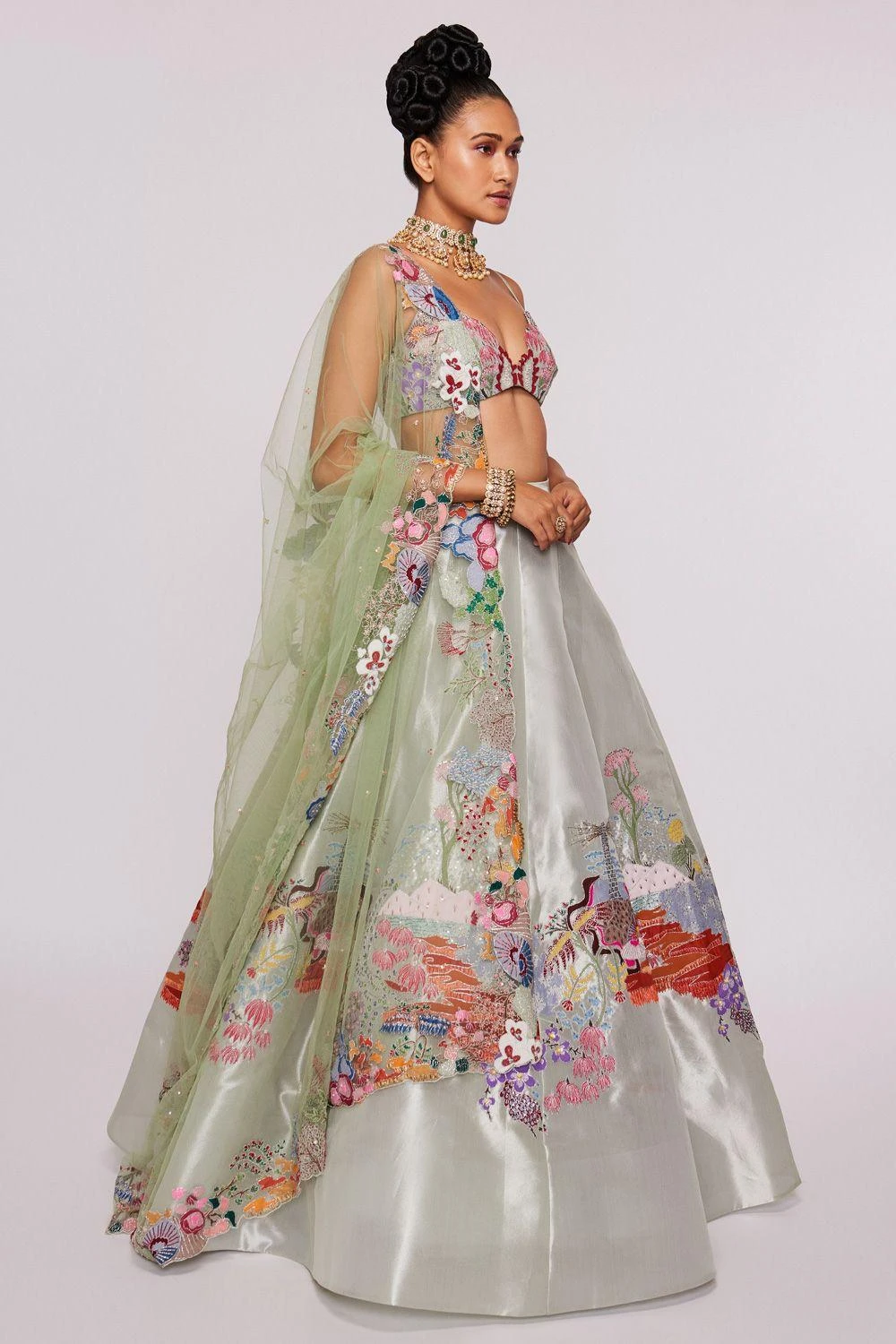 This ivory lehenga represents Aisha Rao’s modern & avant-garde aesthetics as she redefines Indian Couture. It is made in tulle base with applique & embellishments and is offset with a sultry bustier and cutwork tissue dupatta.
