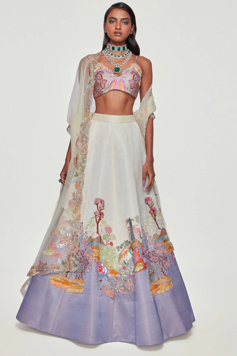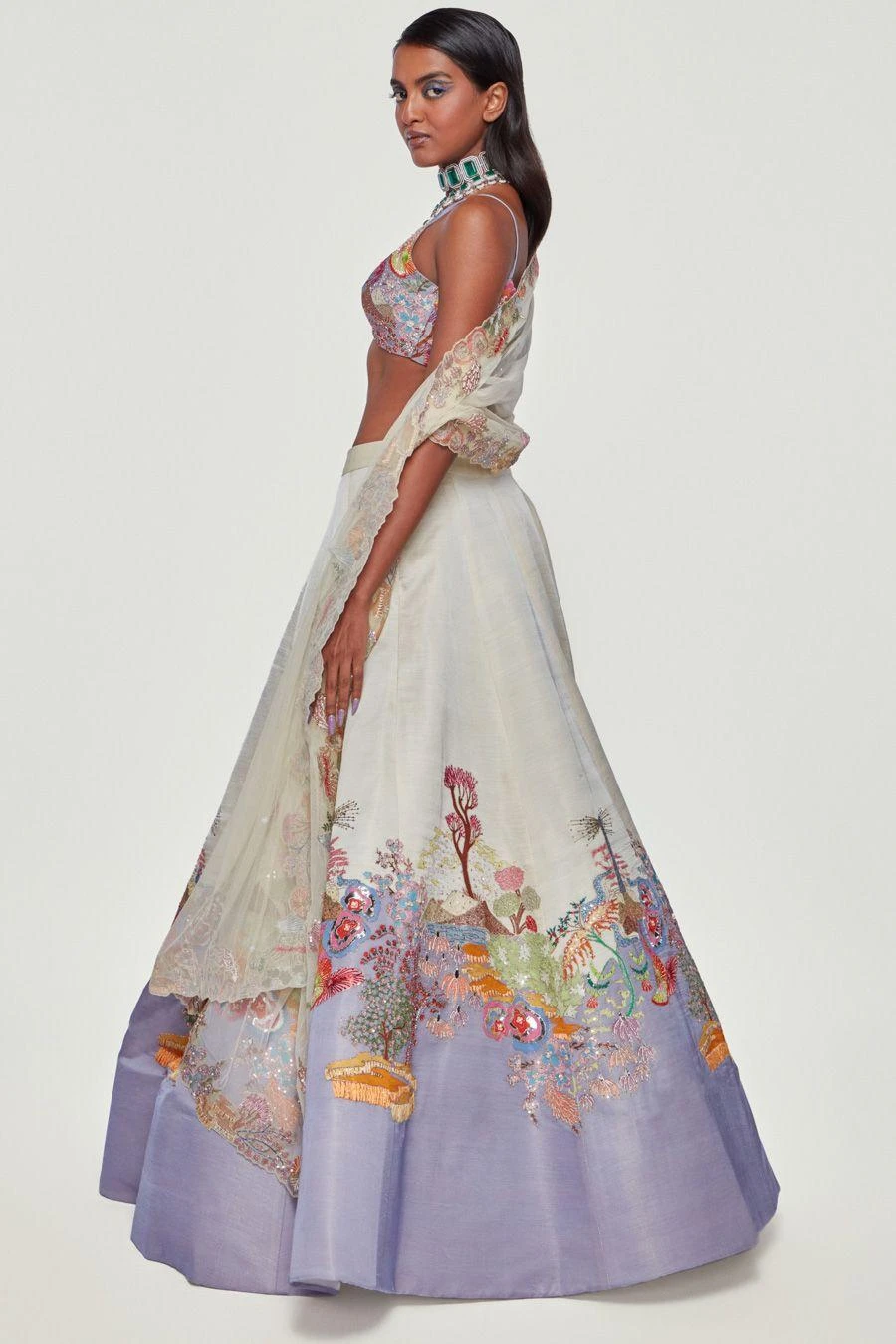 This lavender & ivory lehenga represents Aisha Rao’s modern & avant-garde aesthetics as she redefines Indian Couture. Crafted in kasab satin, this set features a cutwork blouse paired with silk appliqued and patchwork lehenga & a dupatta.