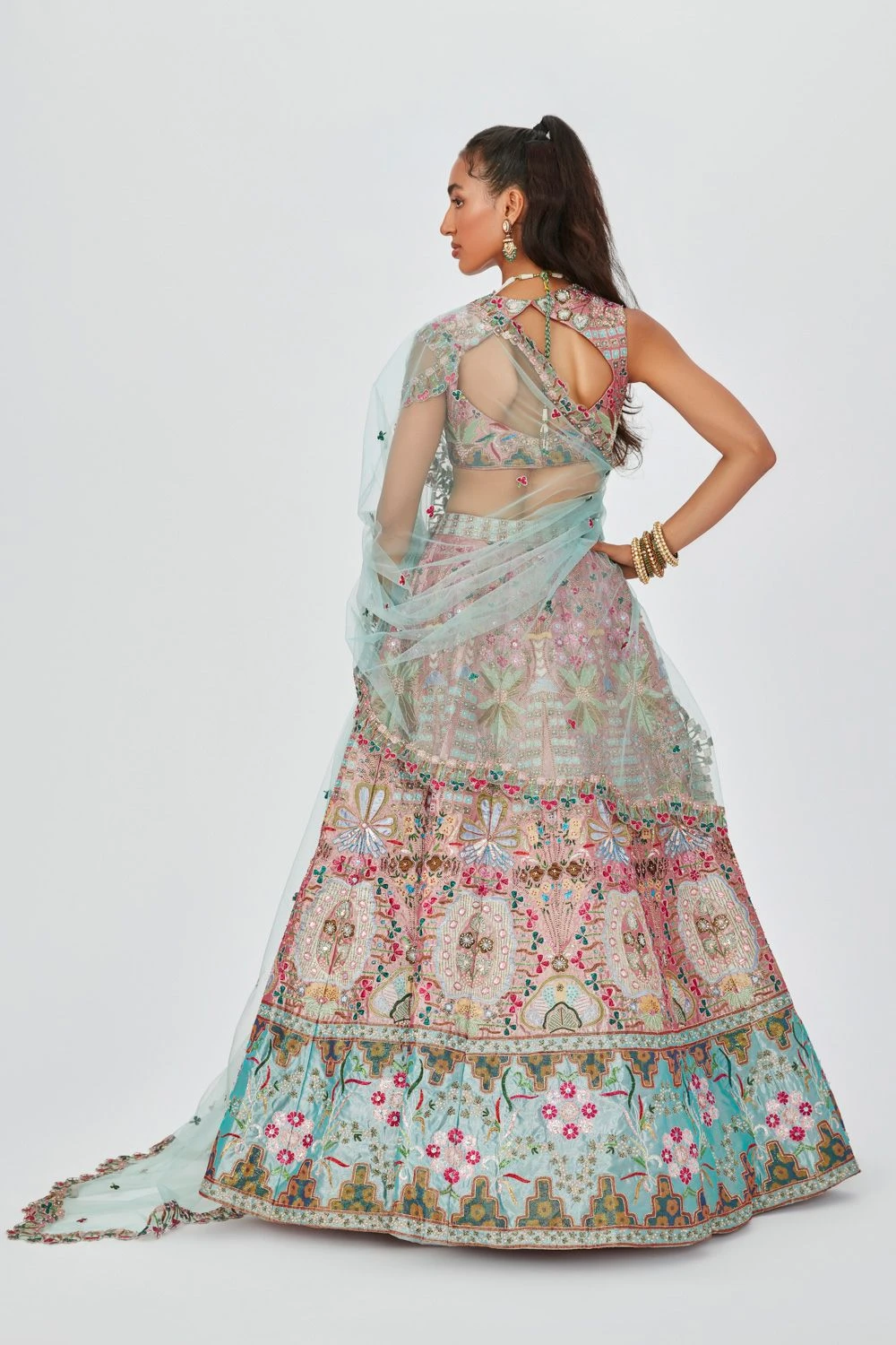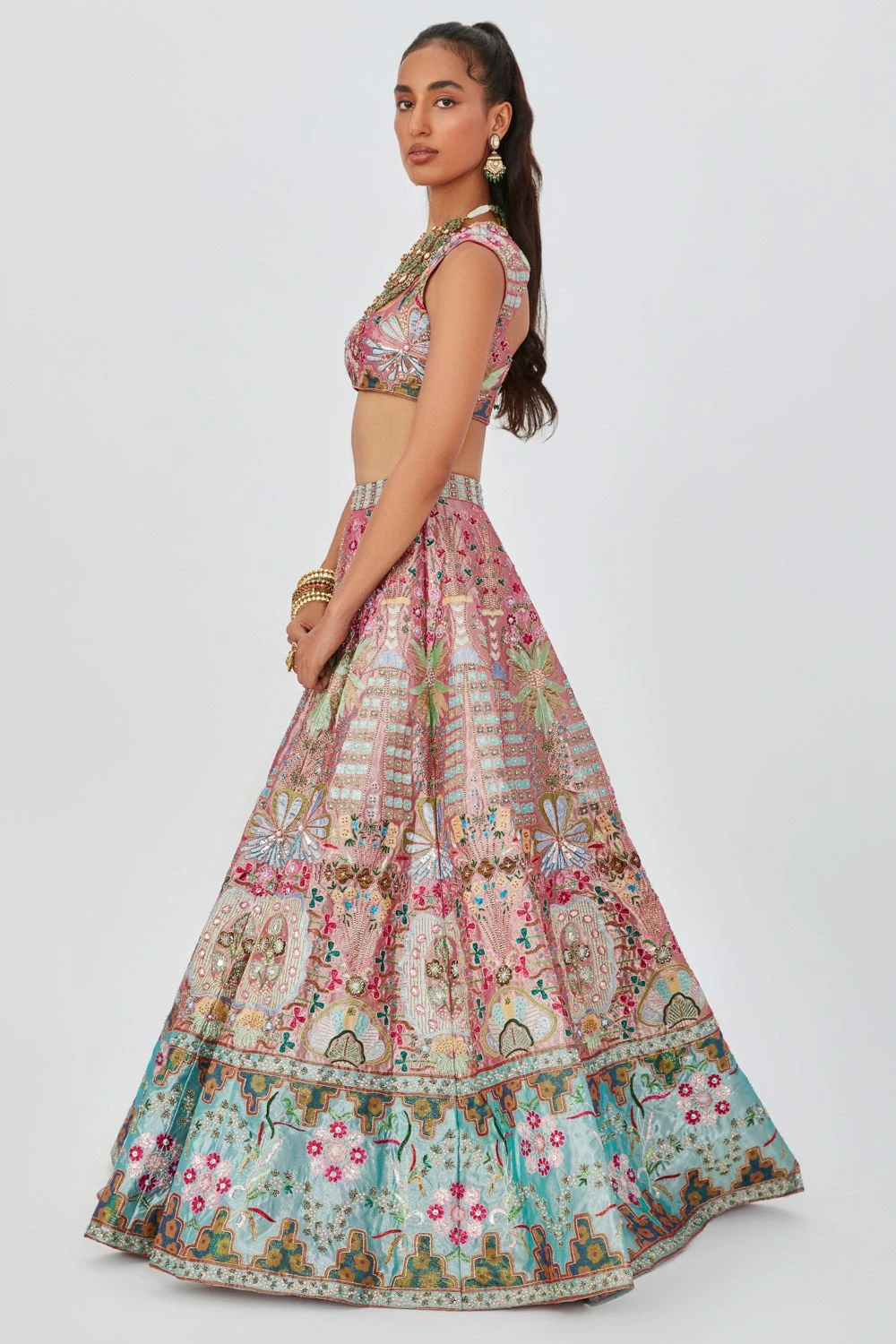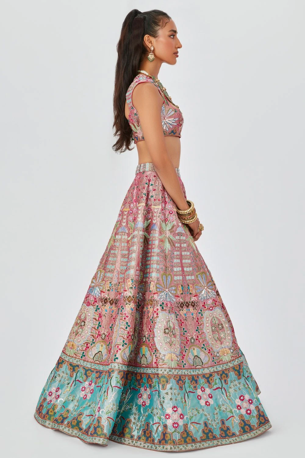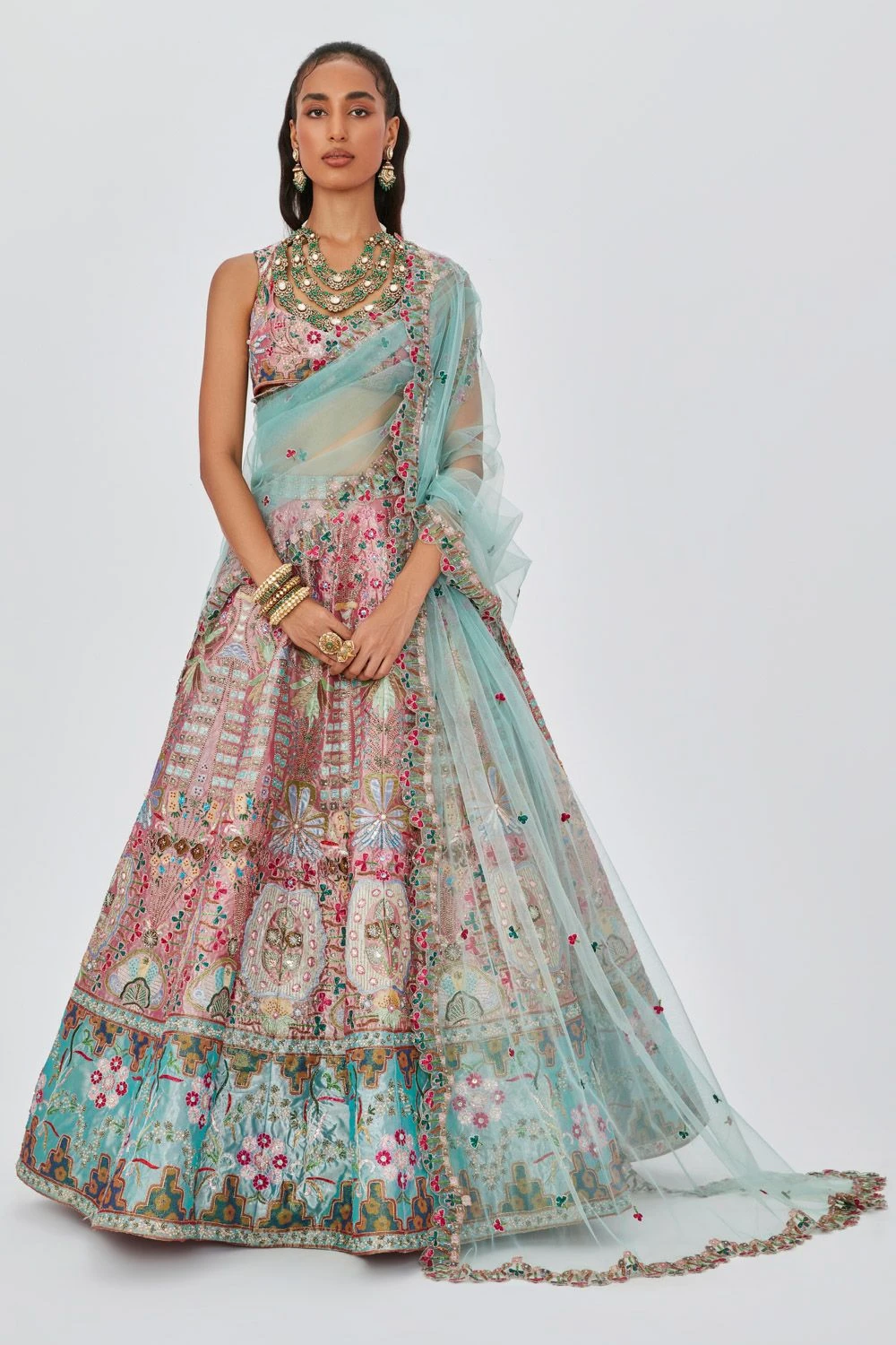 Step into the world of resplendent beauty with this embellished heavy lehenga. This captivating ensemble, paired with a sleeveless blouse and a scallop dupatta, exudes unparalleled elegance.