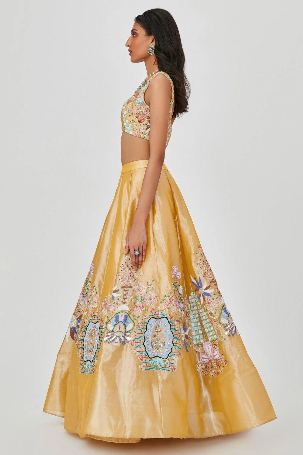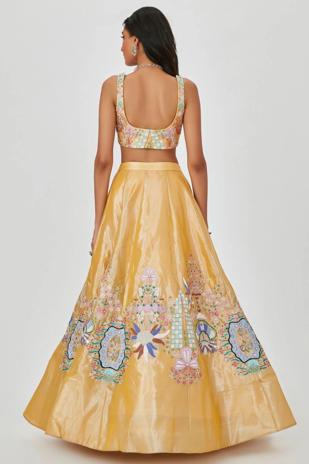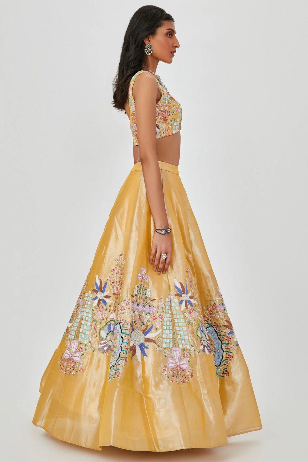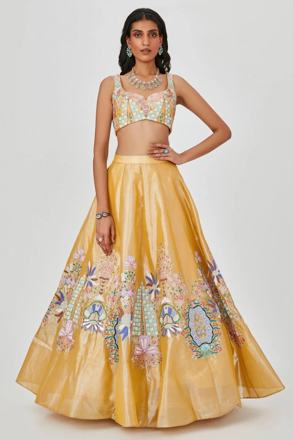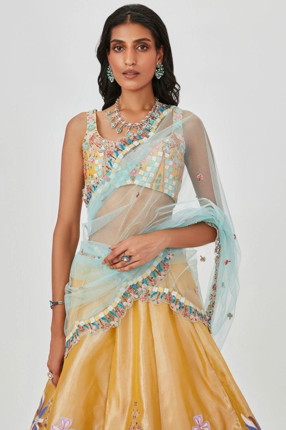 Radiate joy and charm in this appliqued and embellished lehenga. This ensemble boasts a sleeveless blouse & a scallop dupatta, exuding an aura of elegance & sophistication. Embrace the epitome of grace with this breathtaking masterpiece.