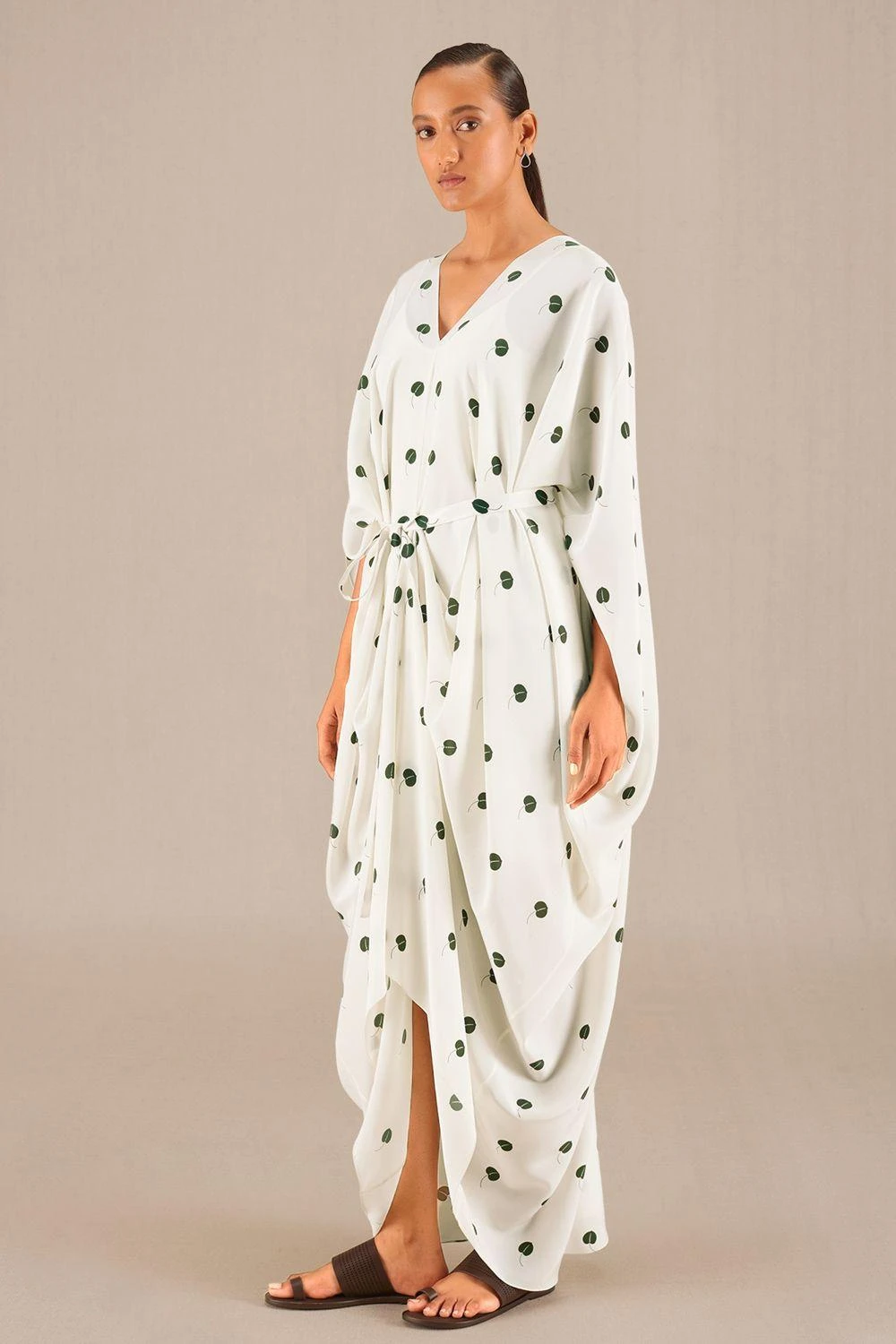 Indulge in the picturesque view of Lake Como with Aysha, crafted in lustrous ivory silk for that luxurious touch. Its cascading silhouette, included inner lining and belt cater to refined taste, perfect for a serene lakeside prosecco brunch.
