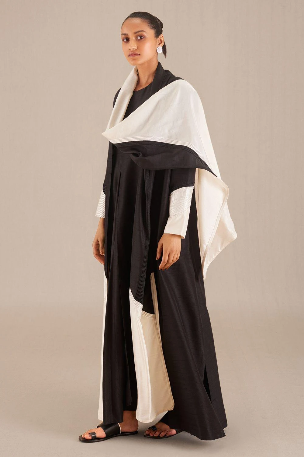 Elevate your style at special events or elegant gatherings with this statement-making silk-blend black abaya. The delicate embroidery & luxurious rose silk drapes make it a captivating choice, perfect for turning heads at weddings or occasions.
