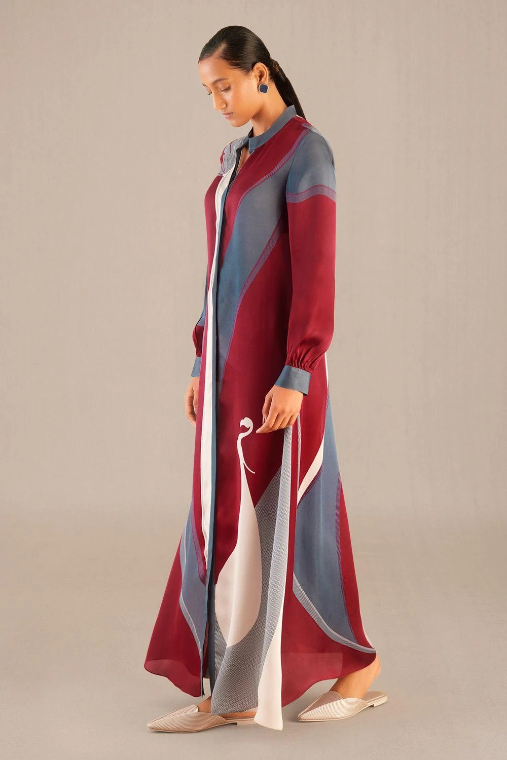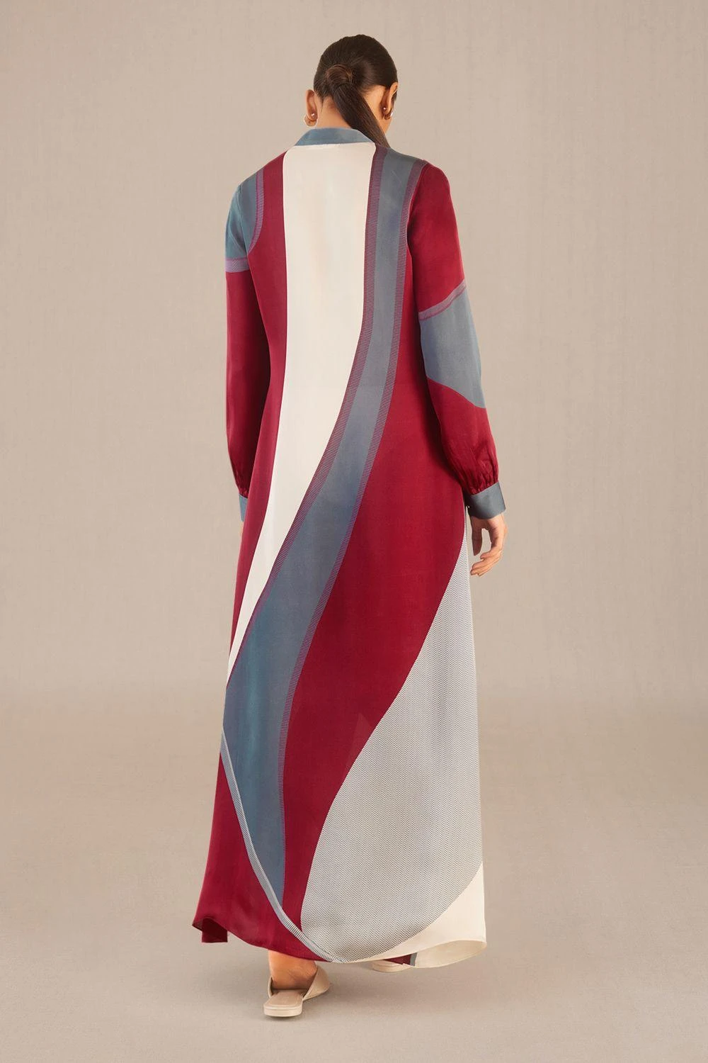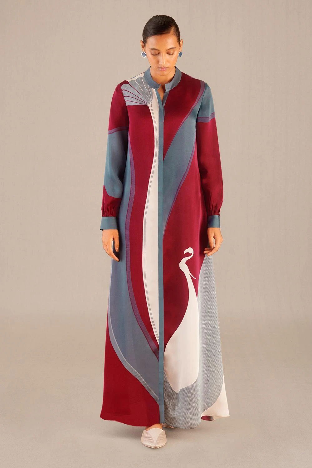 Elegantly crafted in wine & blue, our stunning abstract print abaya in satin-organza base is ideal for extended outings. From brunches to casual gatherings, this stunning piece ensures a stylish & comfortable look for long days out.