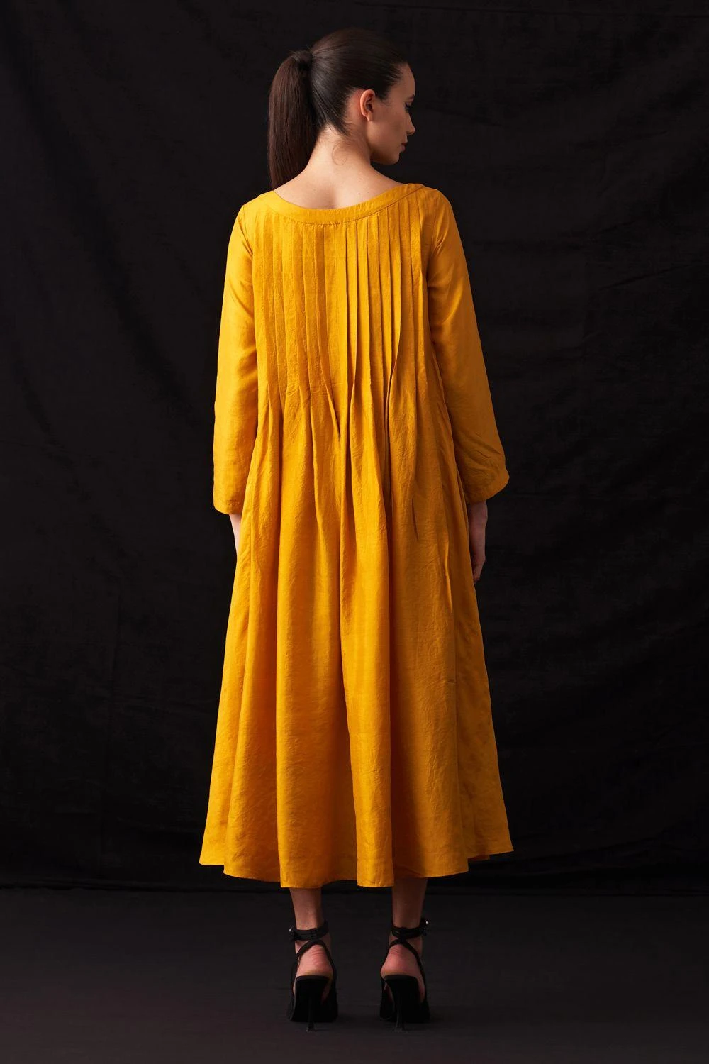 Indulge in timeless elegance with this hand-woven silk pleated yoke dress. Elevate your style with exquisite craftsmanship and a touch of luxury. Add a pair of dangler earrings to complete the look.