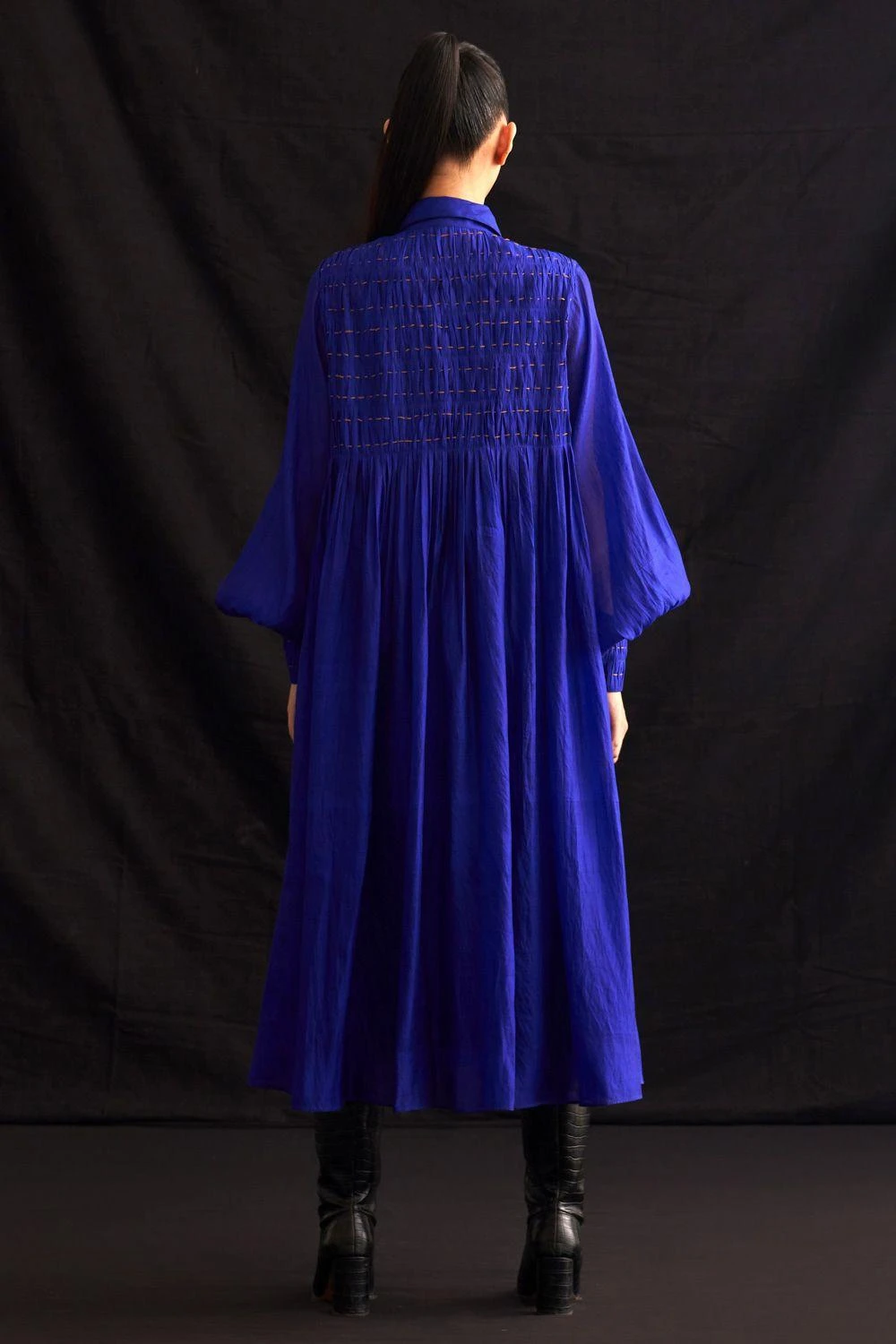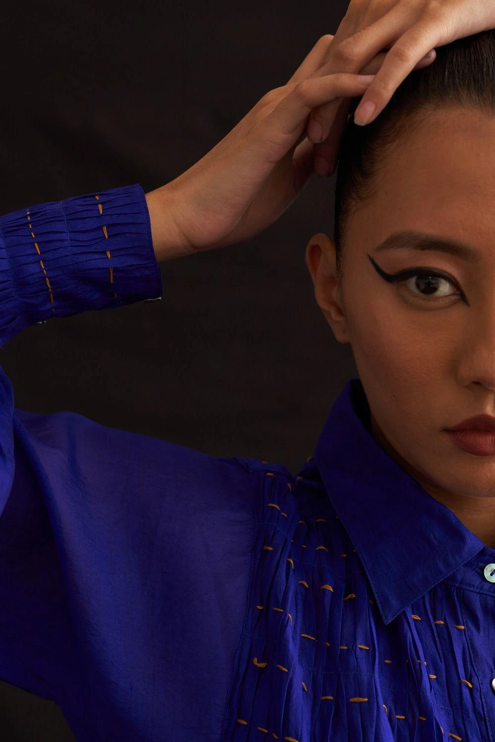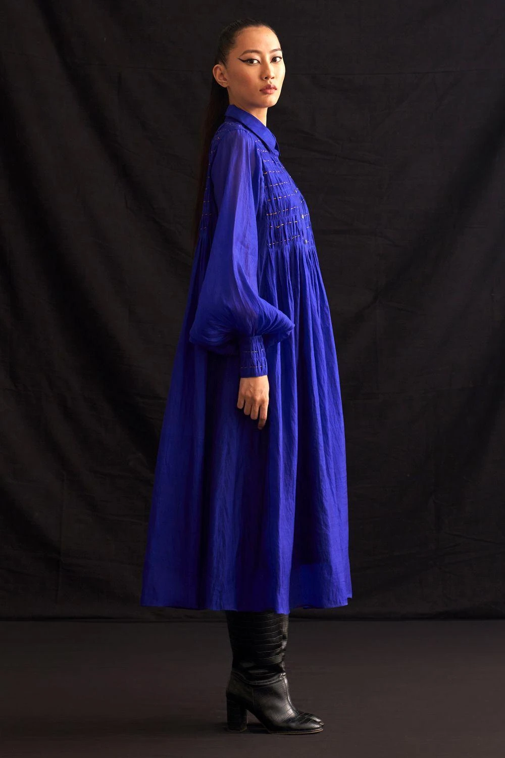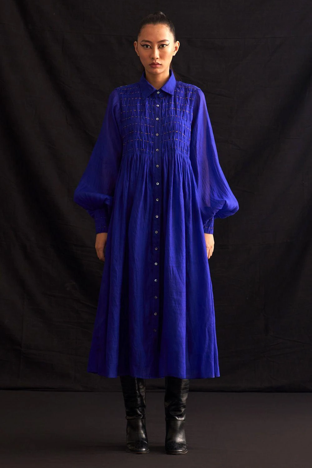 Elevate your style with this hand-woven silk button-down dress. Featuring exquisite hand-embroidered textures on the yoke, it’s a masterpiece of craftsmanship. Add a pair of dangler earrings to complete the look.