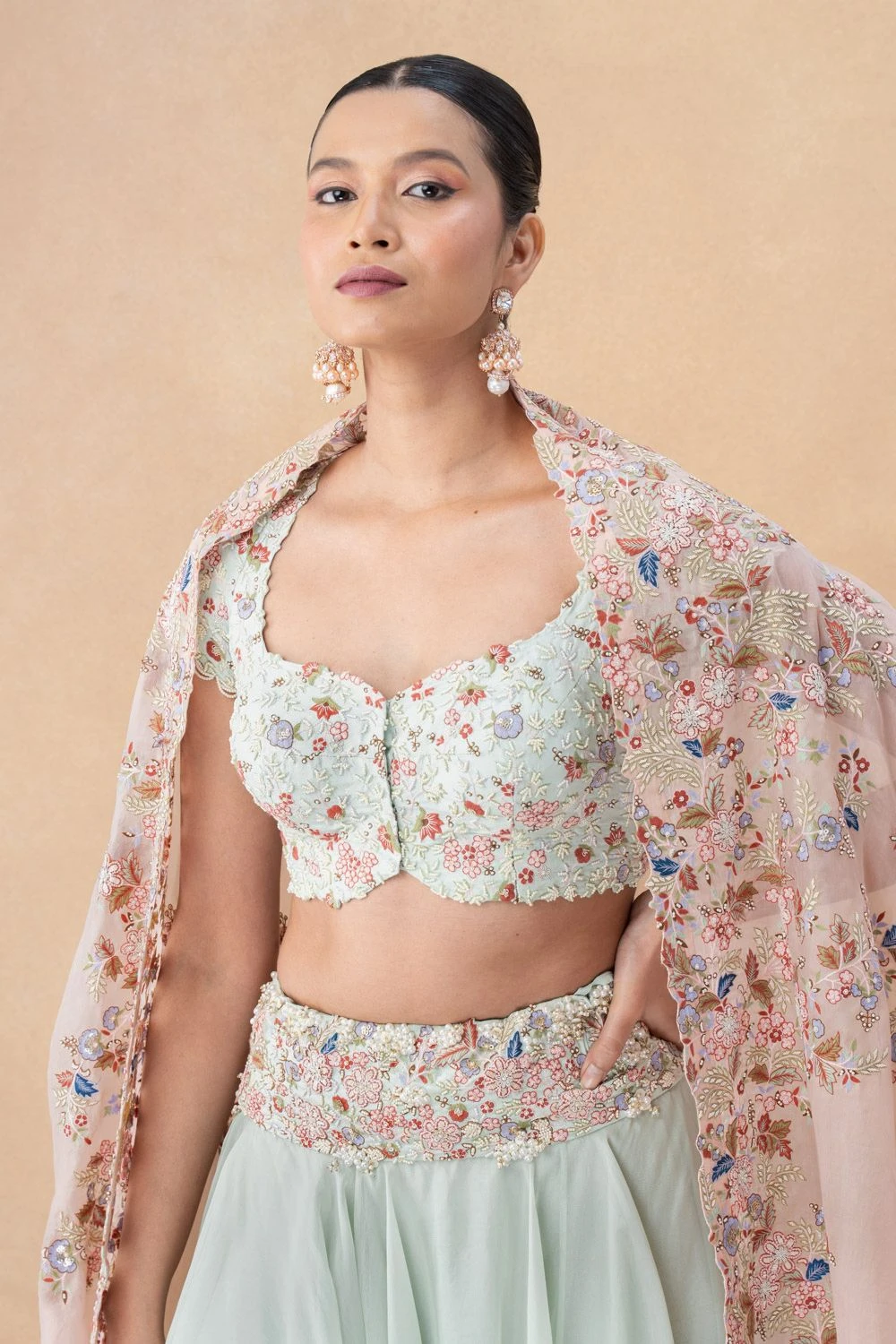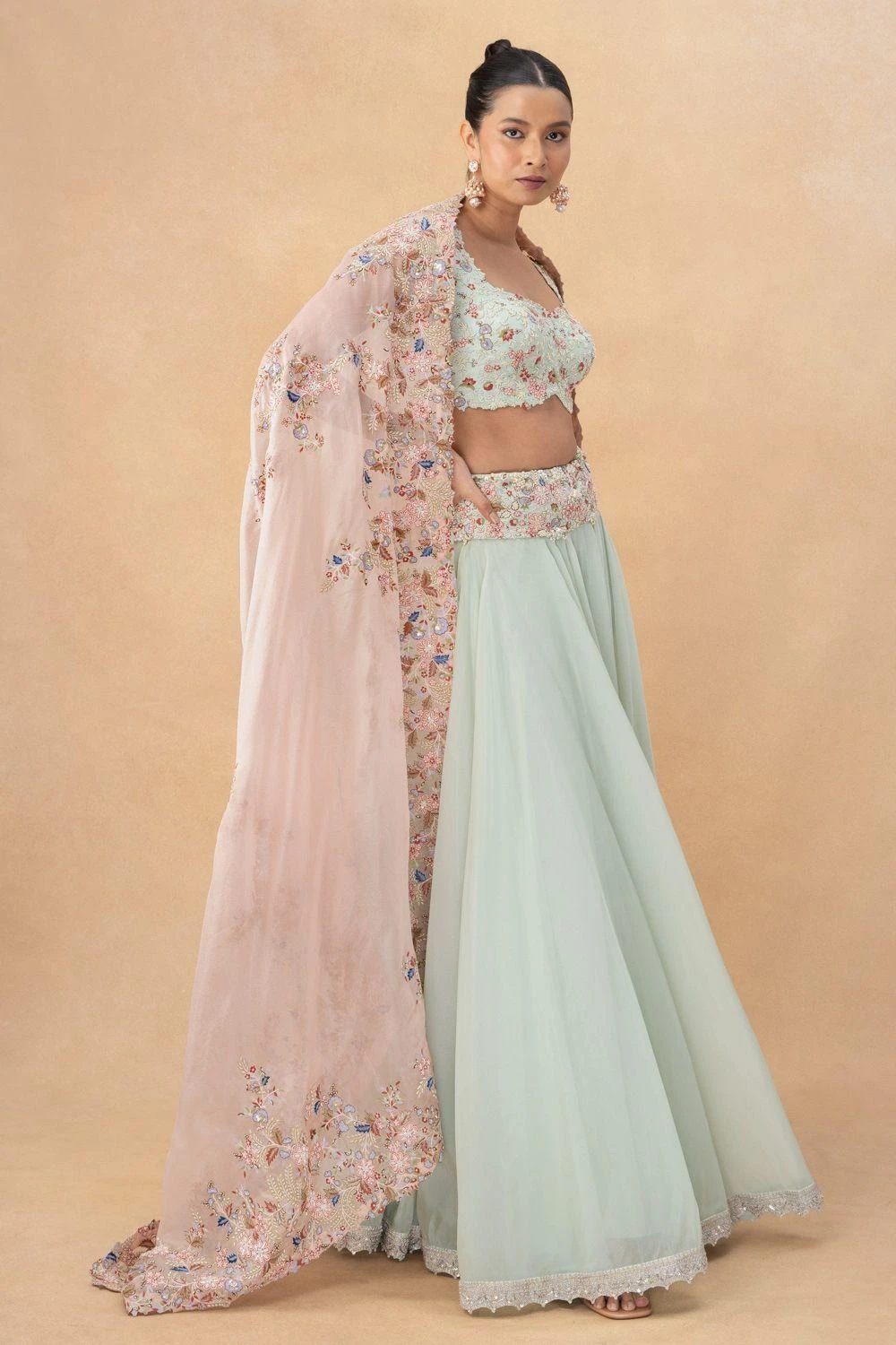 Make a statement as a bride in this stunning lehenga set. Crafted in silk, the intricate floral embroidery adds opulence to this outfit. This set includes a lehenga, an equally versatile blouse, and a dupatta.