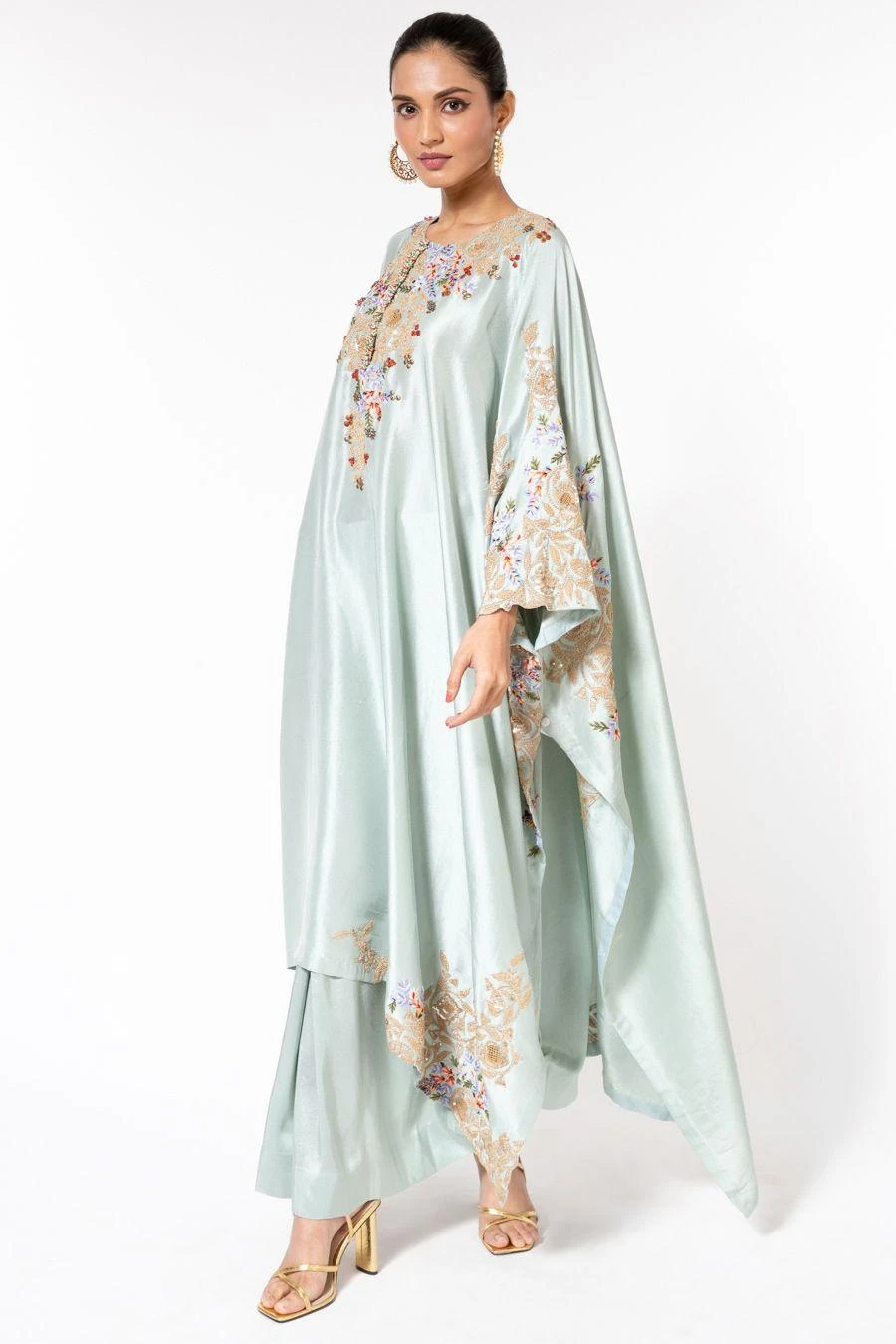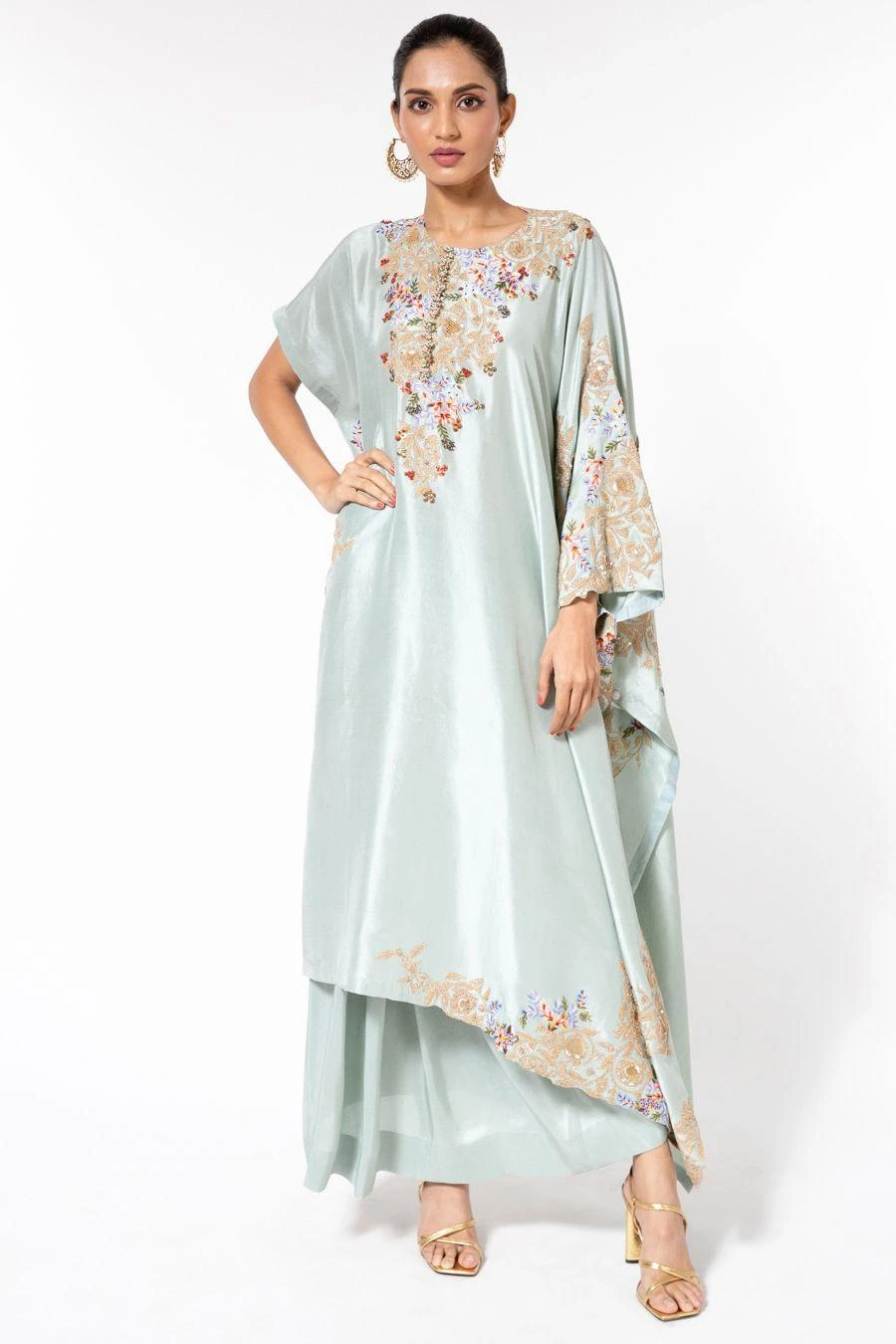 Contemporarize your ethnic closet with this super chic & playful kaftan set. It features an embroidered kaftan, paired with a voluminous skirt. Adorn a pair of statement earrings to complete the look.