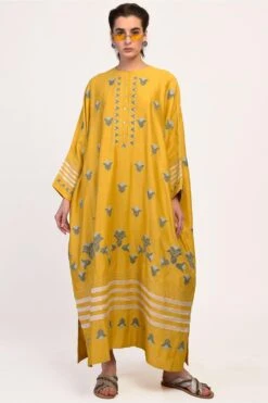 This breezy kaftan set is woven in sumptuous silk and enhanced with vibrant embroidery details. You can style this look with a pair of statement earrings for pre-wedding functions.