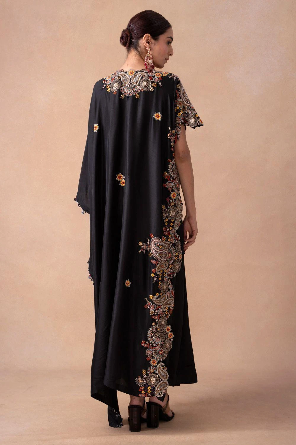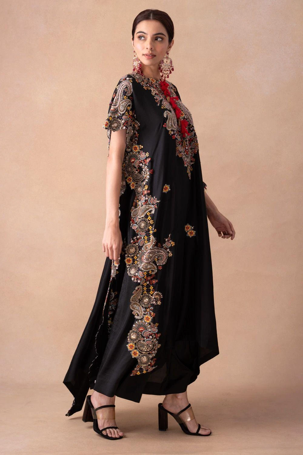 Embark on a sartorial journey with the silk kaftan-skirt set. Adorned with floral, paisley & sequin motifs, enhanced by elegant tassels. Effortlessly transition from sunlit soirÒes to moonlit galas. Elevate every occasion with grace & glamour.