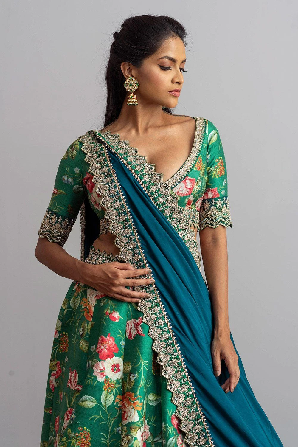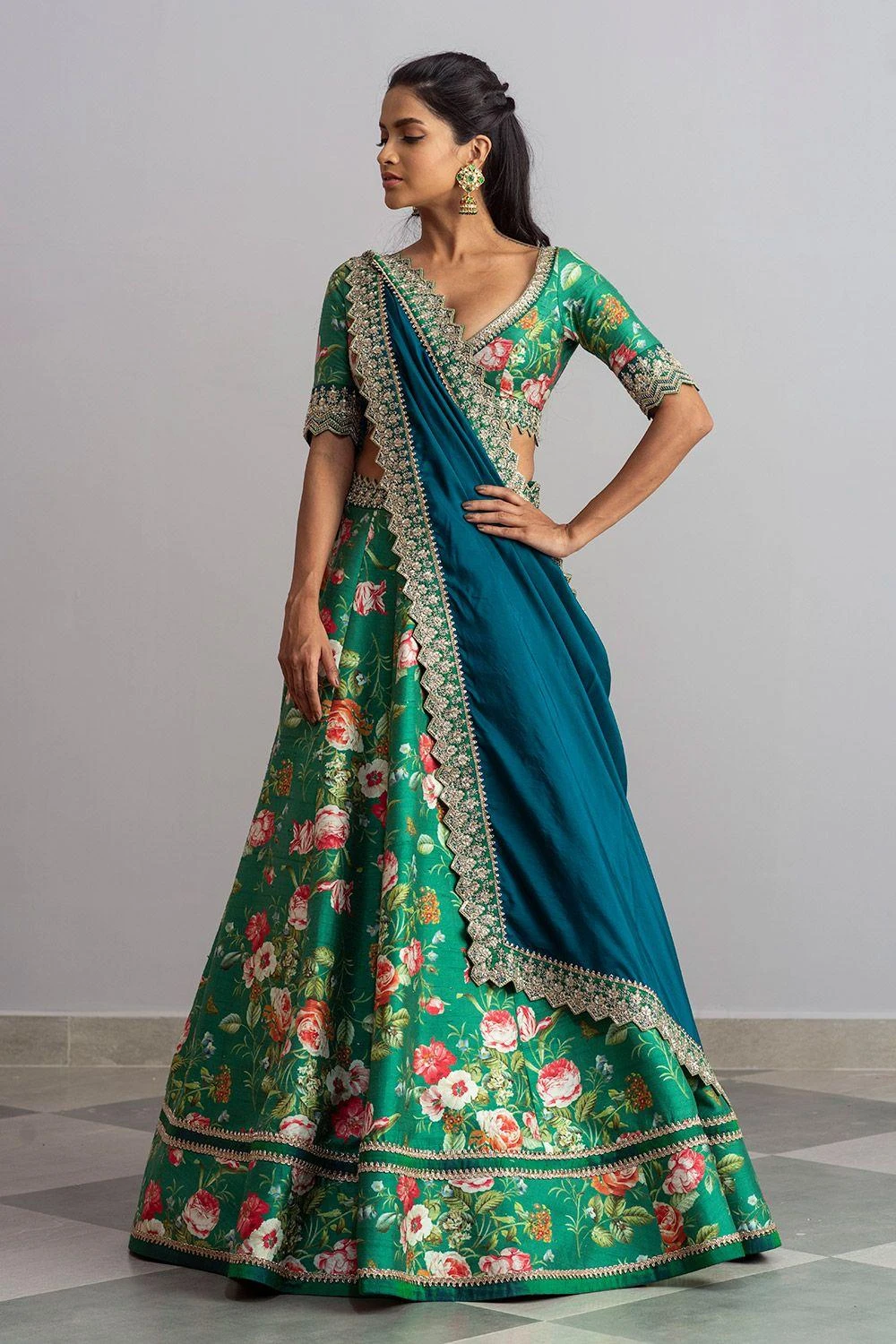 Look absolutely refreshing & radiant in this emerald green lehenga set. It is made in luxe raw silk base and printed in blooming florals. It is paired with a jade blue silk dupatta with zardozi embroidery details.