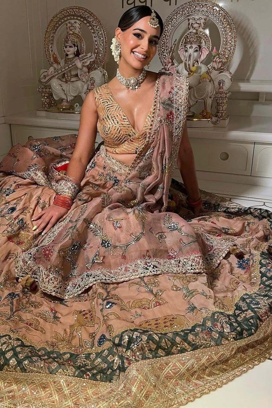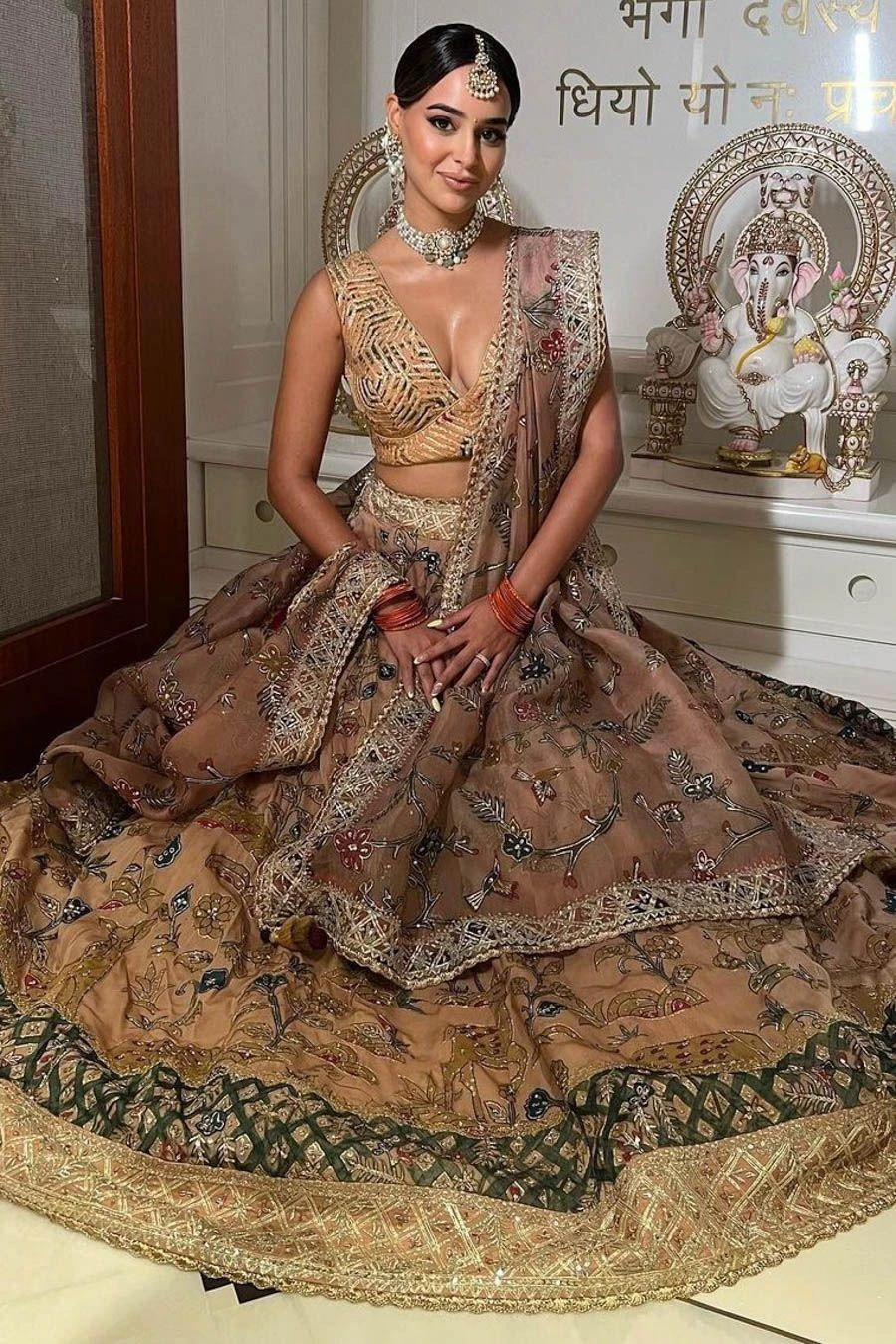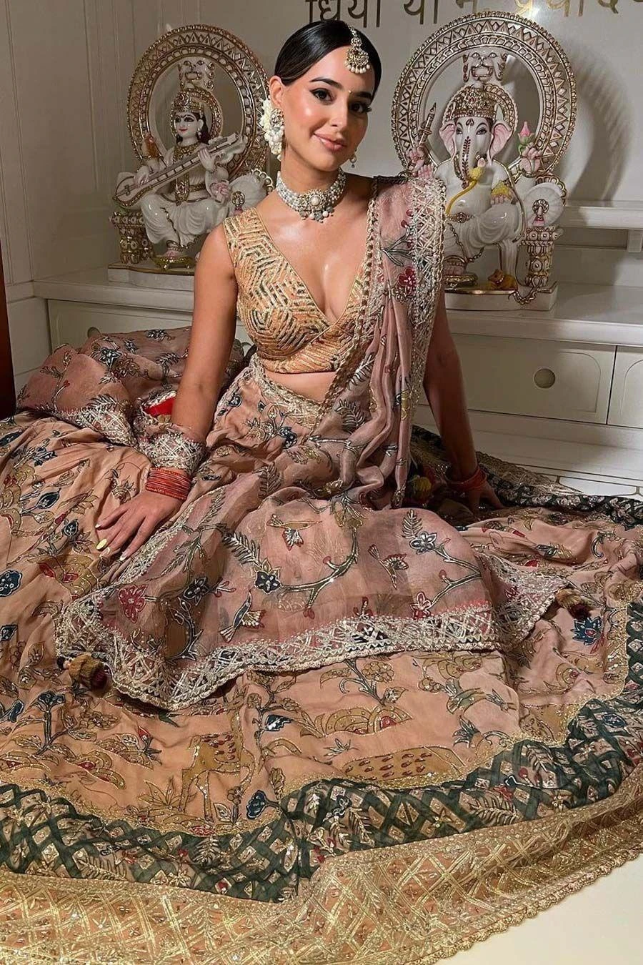 This lehenga set will see you through all kinds of celebrations this wedding season. Crafted in organza & silk, this set features a kalamkari work lehenga paired with a hand painted dupatta and a gota work blouse.
