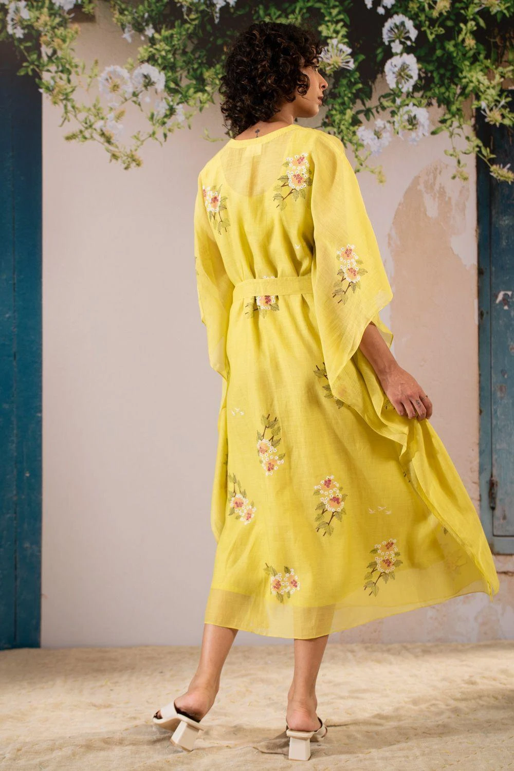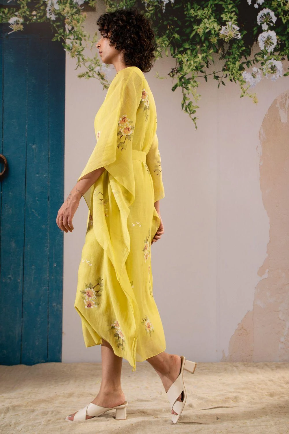 Embrace opulence with this Dahlia Print Long Kaftan, meticulously crafted in Chanderi fabric. A masterpiece of artistry and design, embodying timeless elegance. Elevate your style effortlessly with this symbol of refined sophistication.