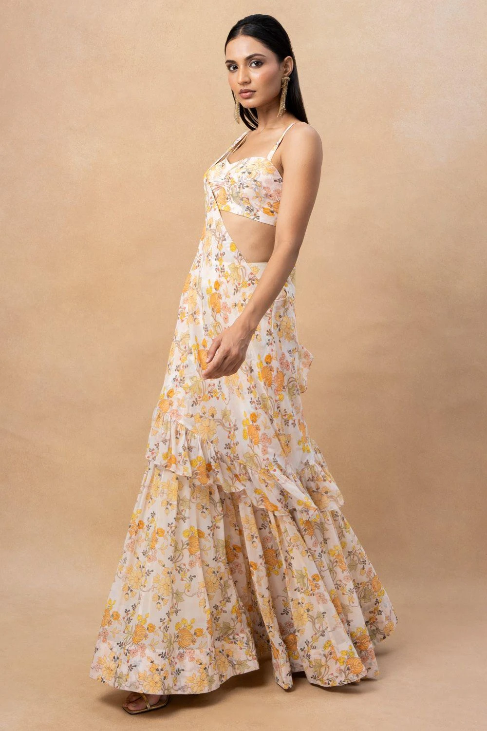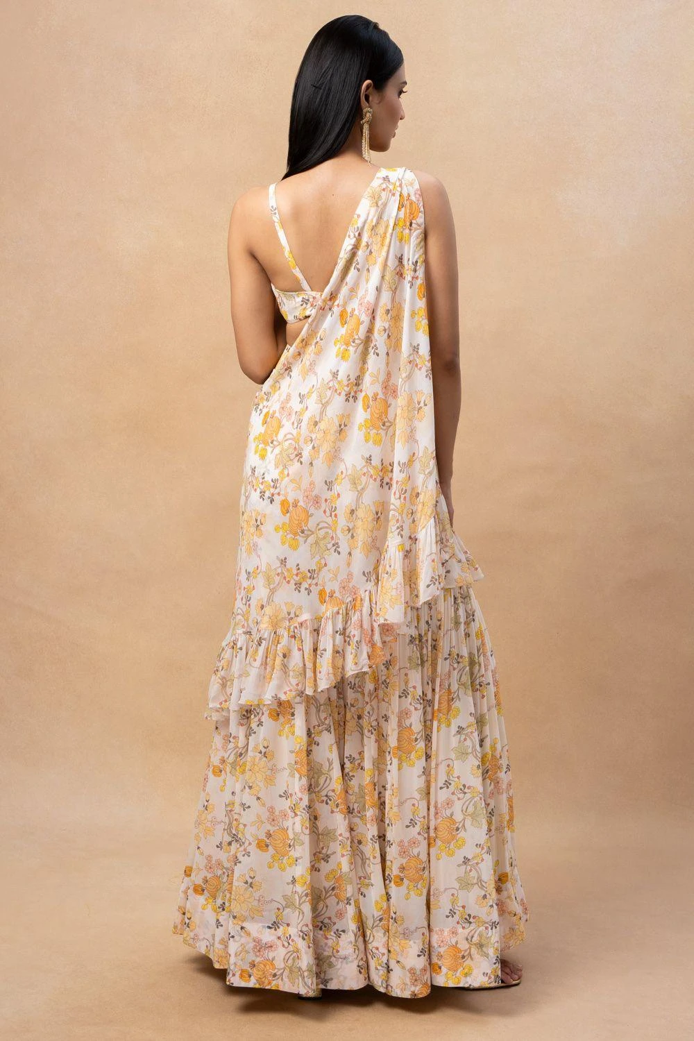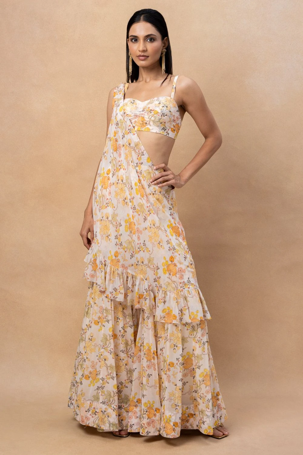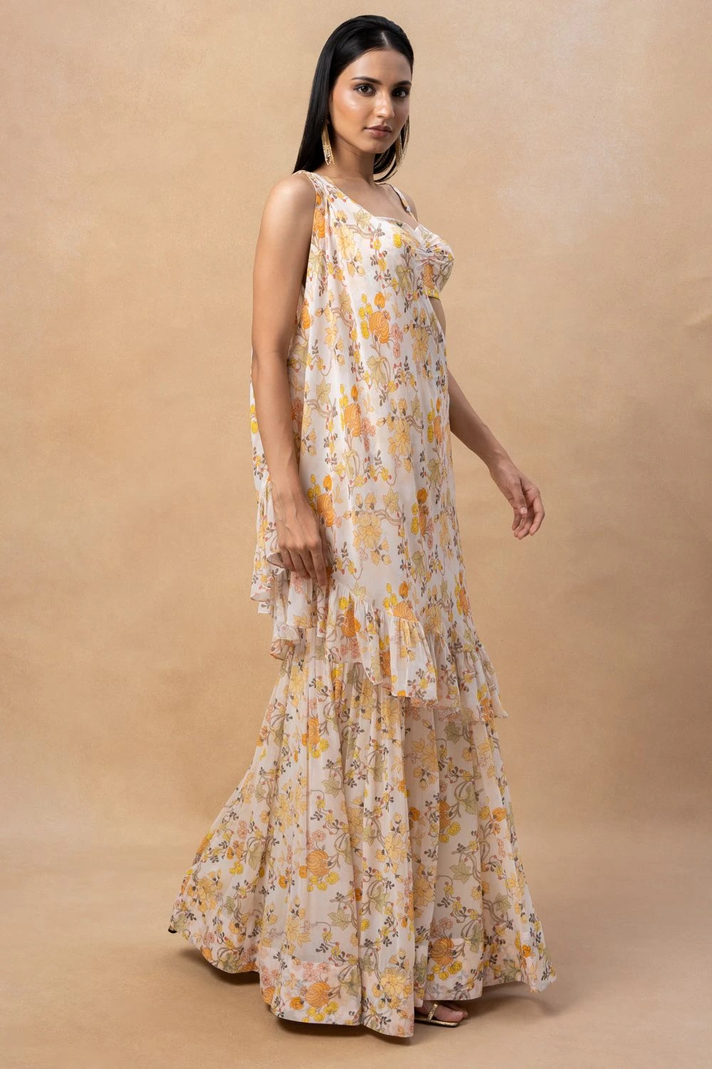 Elevate your style with this floral print gharara, complete with a stunning drape and blouse. Embrace the vibrant colours and intricate floral pattern, adding a touch of grace and sophistication to your ensemble.
