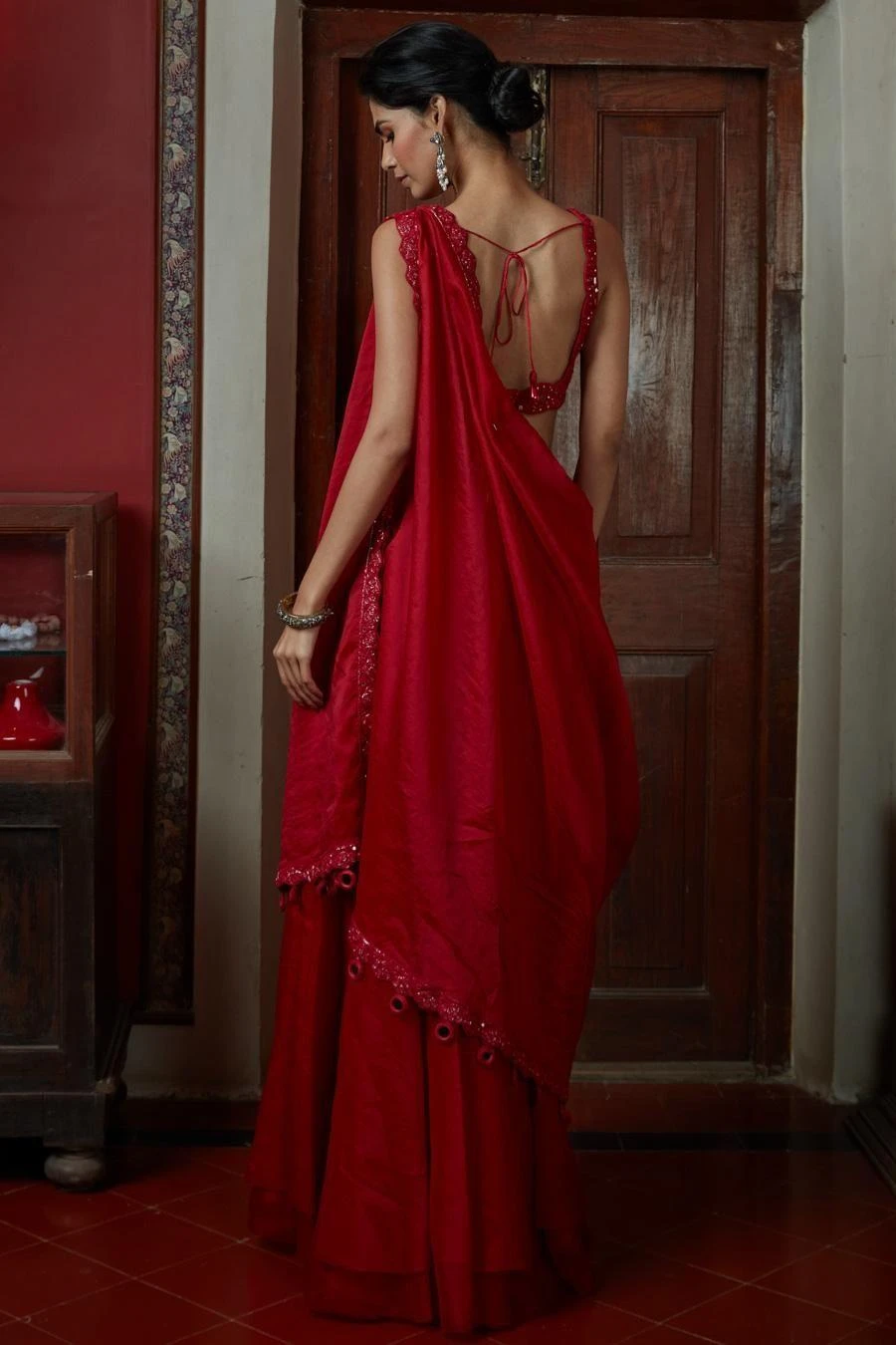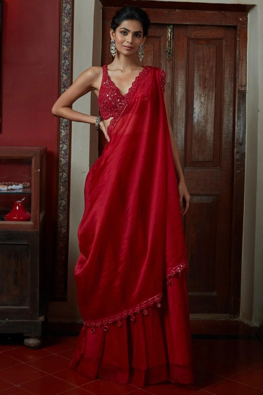 Arpita Mehta’s take on the classic sari silhouette is both fun and feminine, making it the perfect choice for the bridesmaid. Crafted in organza & silk, this set comes with a red sharara paired with a hand embroidered drape & blouse.