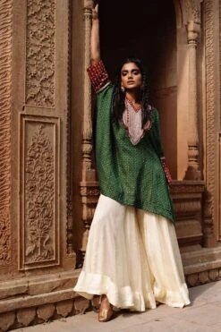 The perfect amalgamation of style & comfort, this set works across occasions. Crafted in silk cotton & organza, this set features a kaftan with embroidered marodi work on the yoke,cuff and bottom panel paired with off white cotton lycra pants.