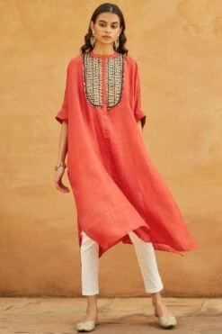 The perfect amalgamation of style & comfort, this kaftan set is perfect for a day out. This kaftan features a black yoke with marodi work & sequence trim detailing paired with cotton lycra pants. Style it with dainty jewellery to complete the look.