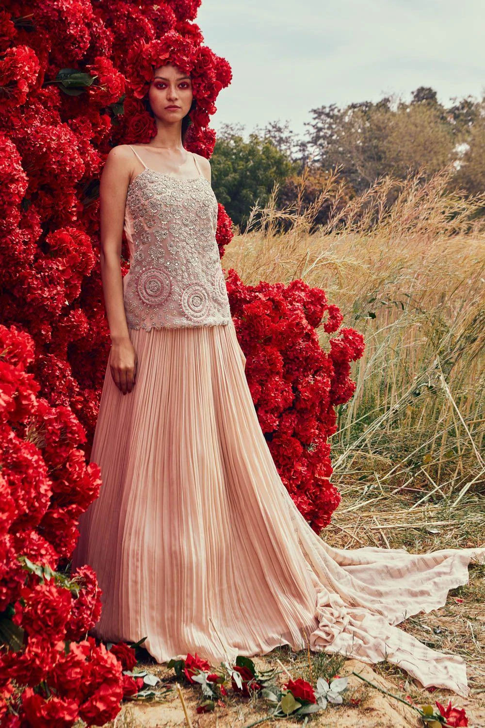 Begin your celebrations on a vibrant note with this playful champagne lehenga set. It features a lehenga paired perfectly with a sleeveless zardosi, dabka, pearl, sequin, mirror work & thread work embroidered short kurta & dupatta.