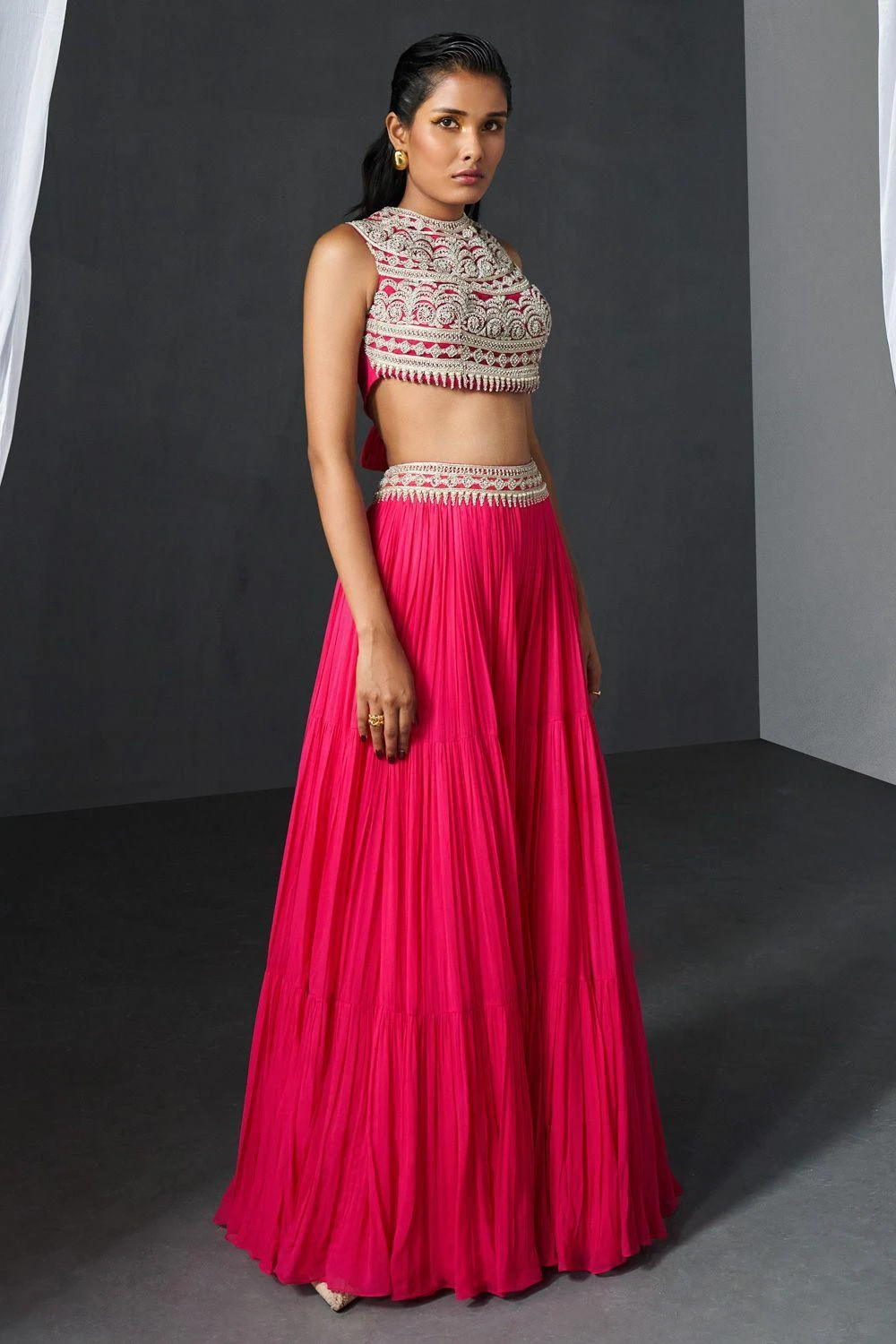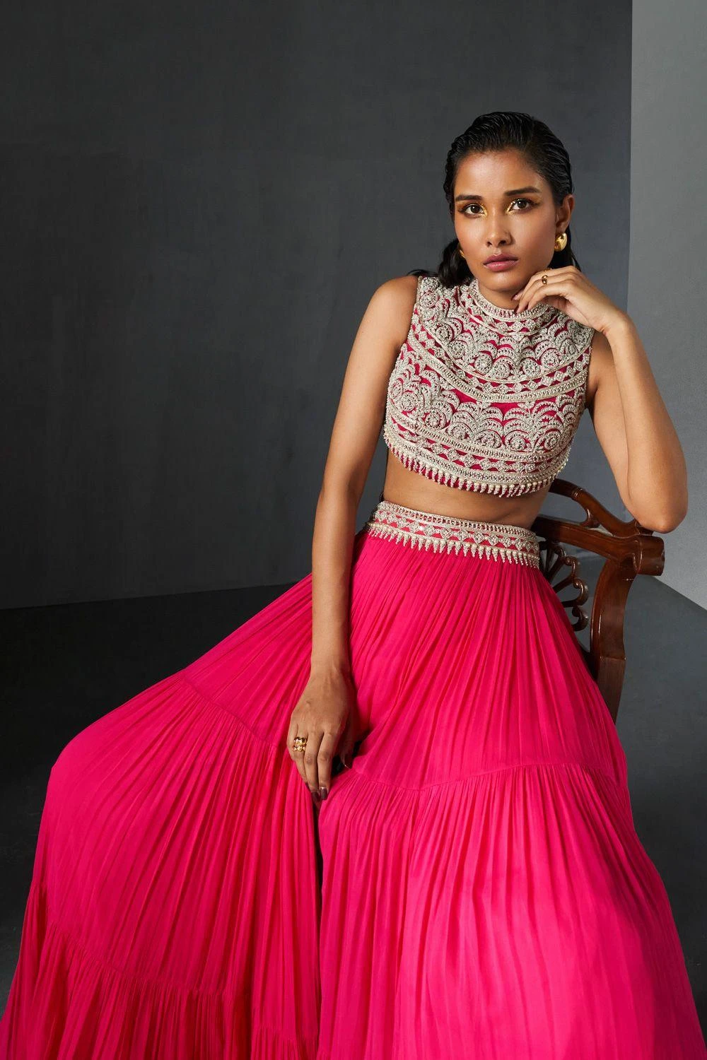 Indulge in luxury with this fuchsia blouse, adorned by intricate geometrical pattern embroidery. Paired seamlessly with sharara pants, it’s a fusion of artistry and design that embodies sophistication.
