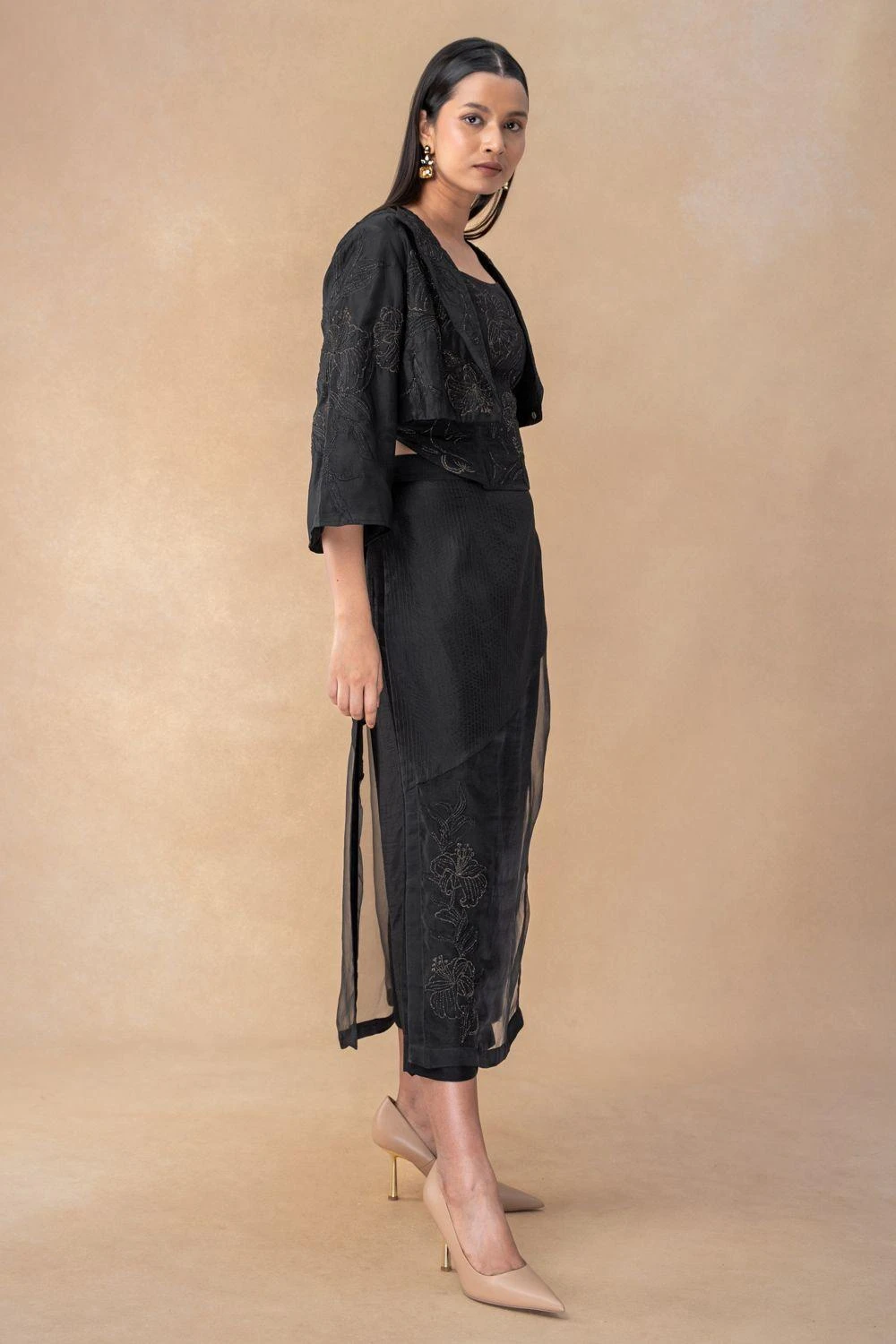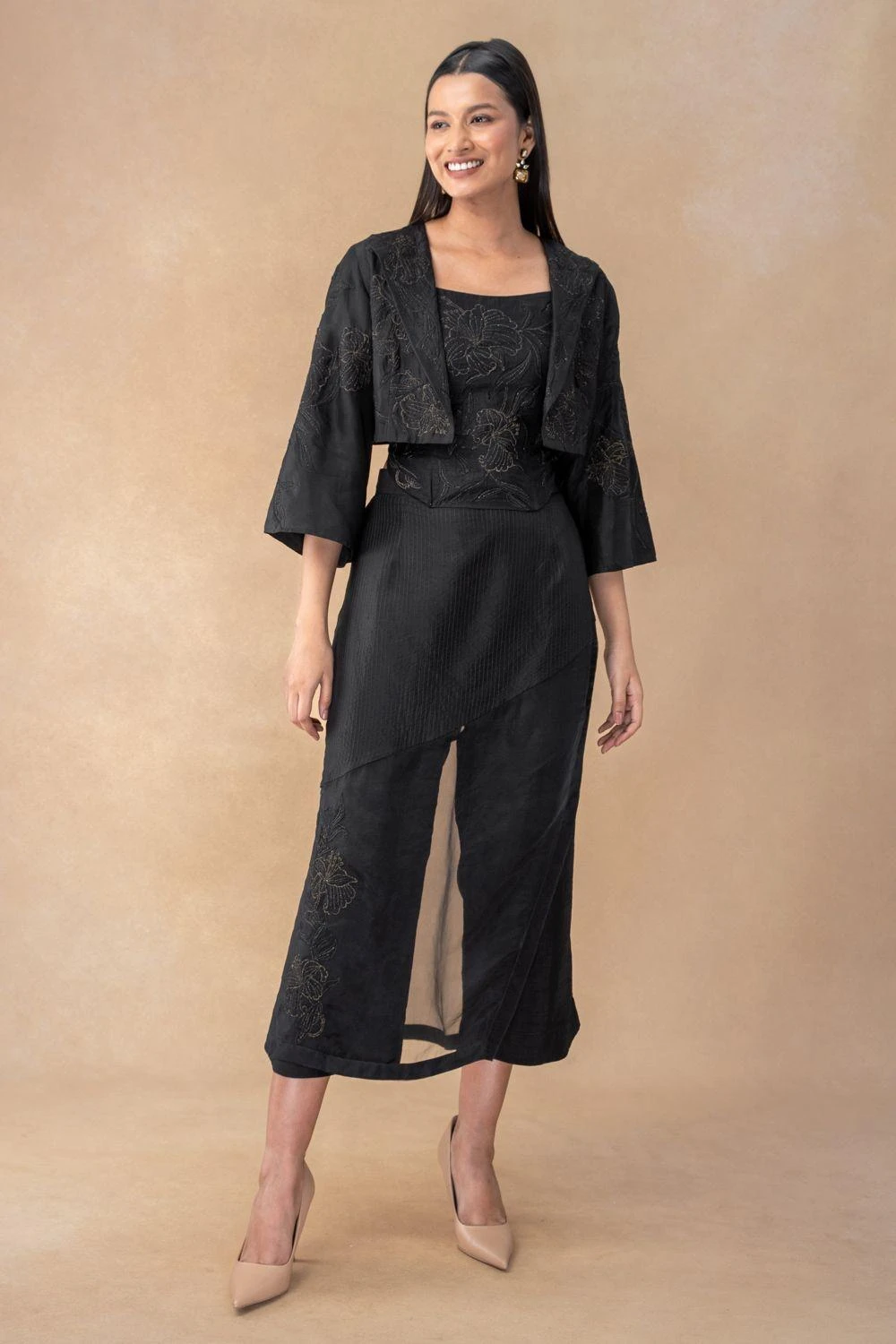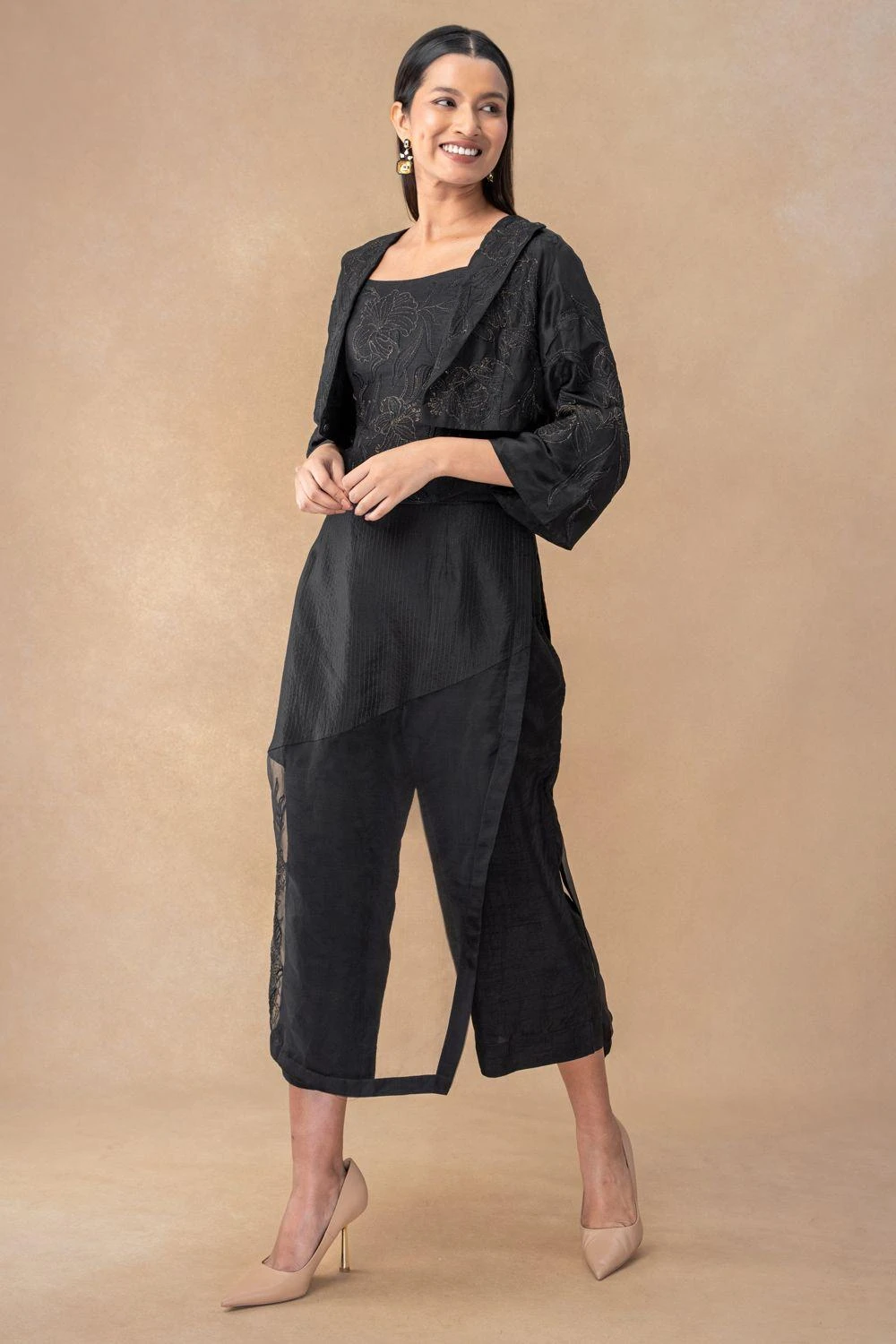 Elevate your style with these black straight pants featuring a chic textured overlay. Pair it with a coordinating jacket & corset from the collection to complete the set.