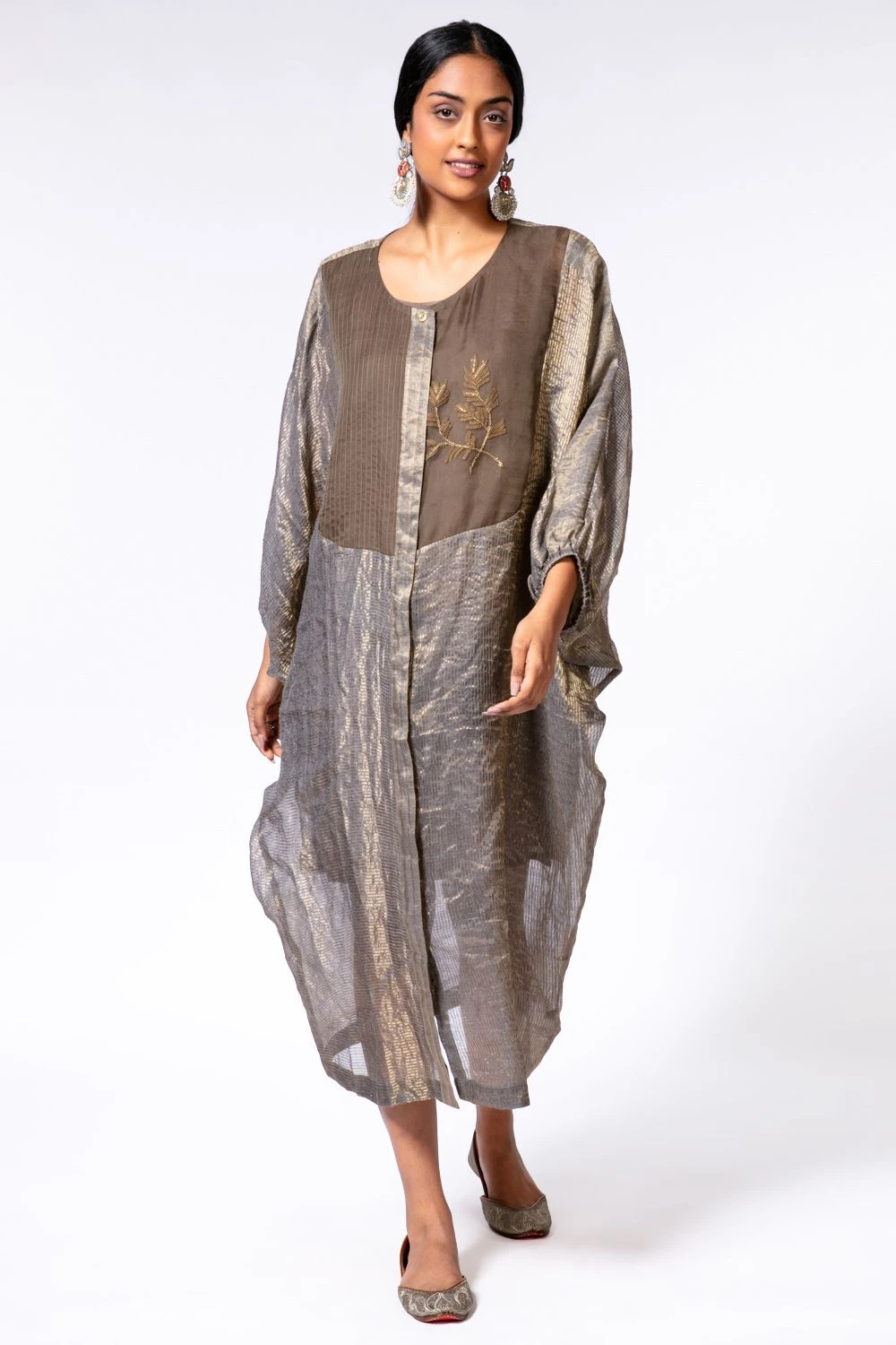 This metallic kaftan dress with a slip comes in handy for your off duty festive looks. It is woven in silk tussar, zari & organza fabric & enhanced with intricate zari embroidery. You can elevate this look with a pair of statement earrings.