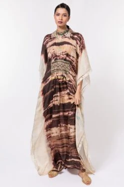 Indulge in bohemian euphoria with this tie-dye beauty in ivory & brown. This collared kaftan is cut in habutai silk and accentuated with an embellished waist in beads & tassels. Style it with a statement silver choker to complete the look.