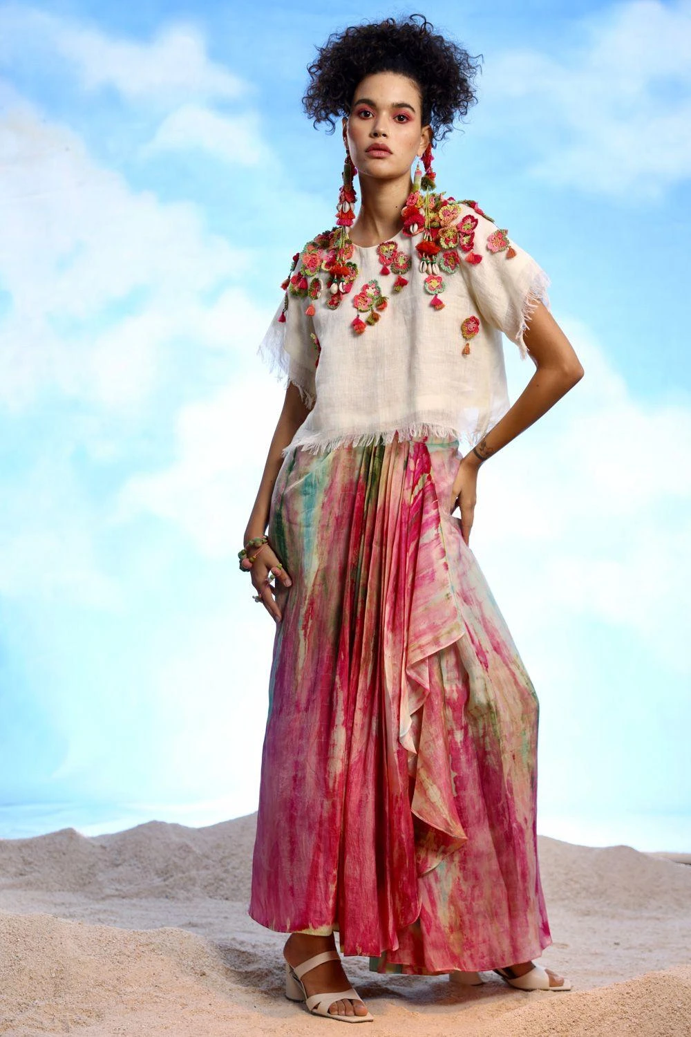 Experience the mesmerizing beauty of this Tie Dye Pleated Skirt, designed to captivate with its vibrant colours and asymmetrical pleats. The flowing silhouette and subtle lining add an extra touch of elegance.