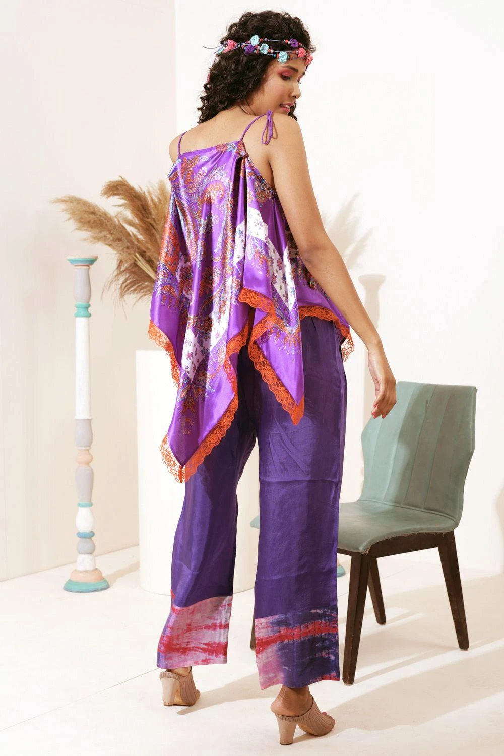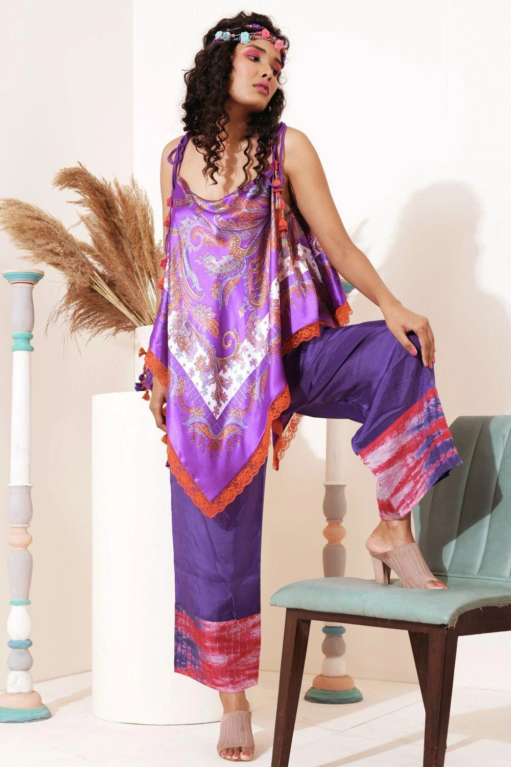 This purple printed cowl top is cut in luscious satin silk and features dori string for sleeves which adds an interesting element. You can team it up with a pair of bell bottom denims.
