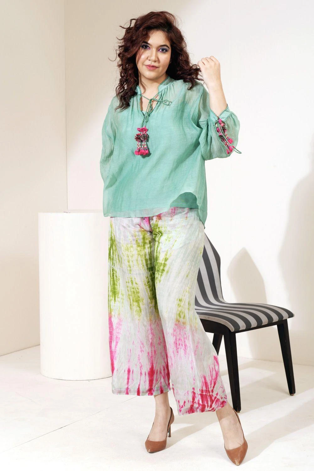 Instantly elevate your basic looks with these tie & dye mint & pink straight pants. It is cut in habutai silk with a relaxed fit with an elasticated waist belt.