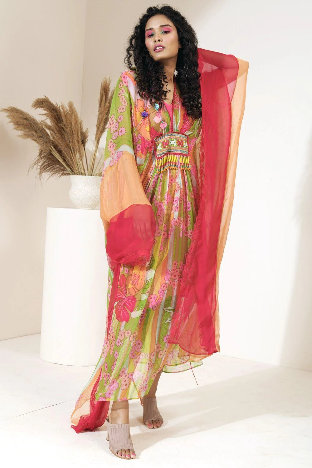 This artsy tie dye panelled kaftan is set in vibrant tones of orange & magenta. It is cut in georgette with embroidered waist patch and tassel detailing. You can wear it for a daytime intimate celebration.