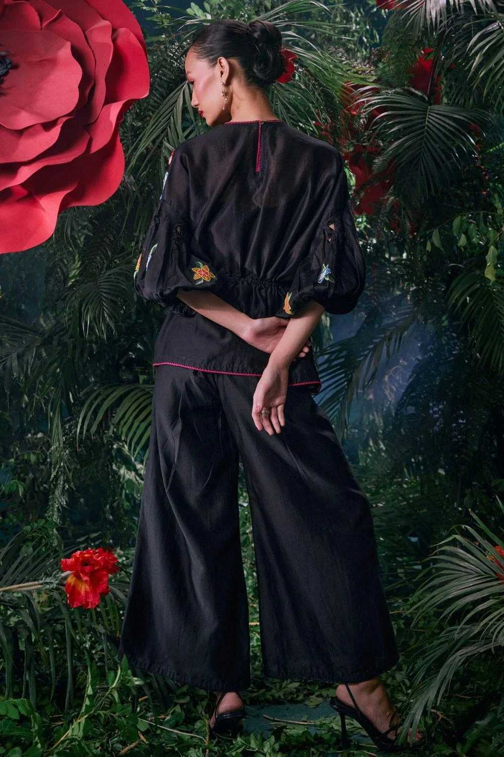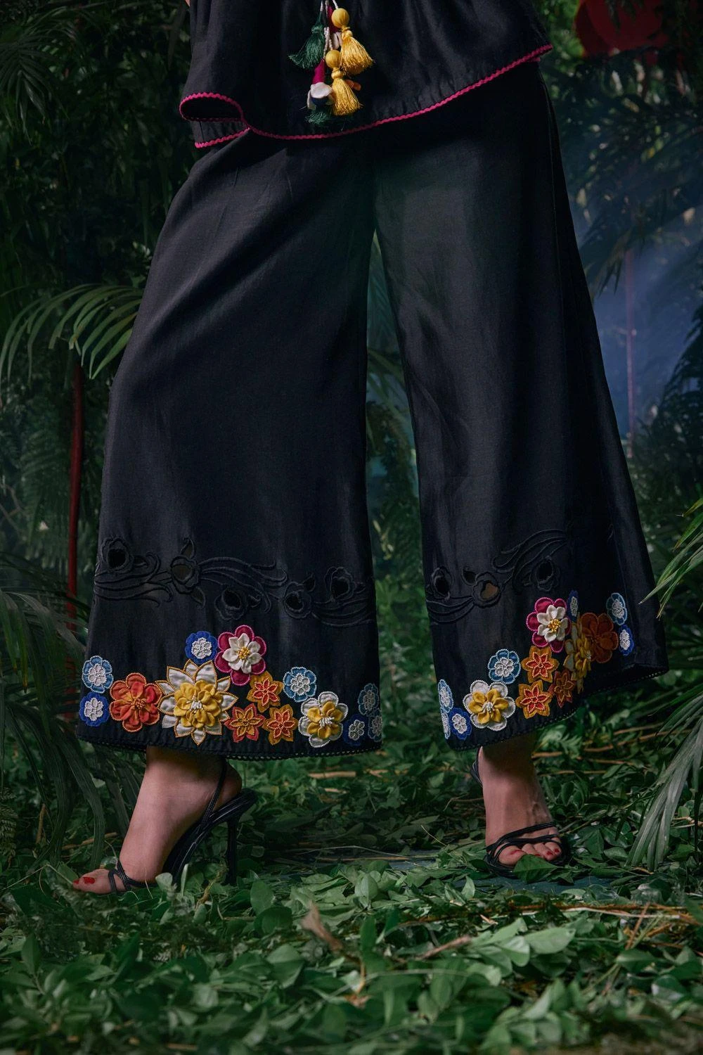 Step into opulent elegance with these Black pants, exquisitely adorned with 3D floral applique and cutwork. This ensemble defines the perfect fusion of artistic craftsmanship and modern sophistication, setting the stage for a remarkable look.