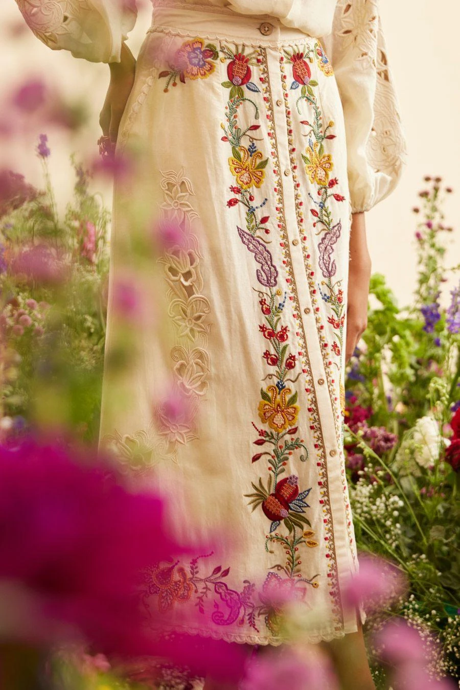 Crafted in chanderi, this buttoned down ivory skirt features threadwork details. Style them with the Ivory petal shirt from the collection to complete the look.