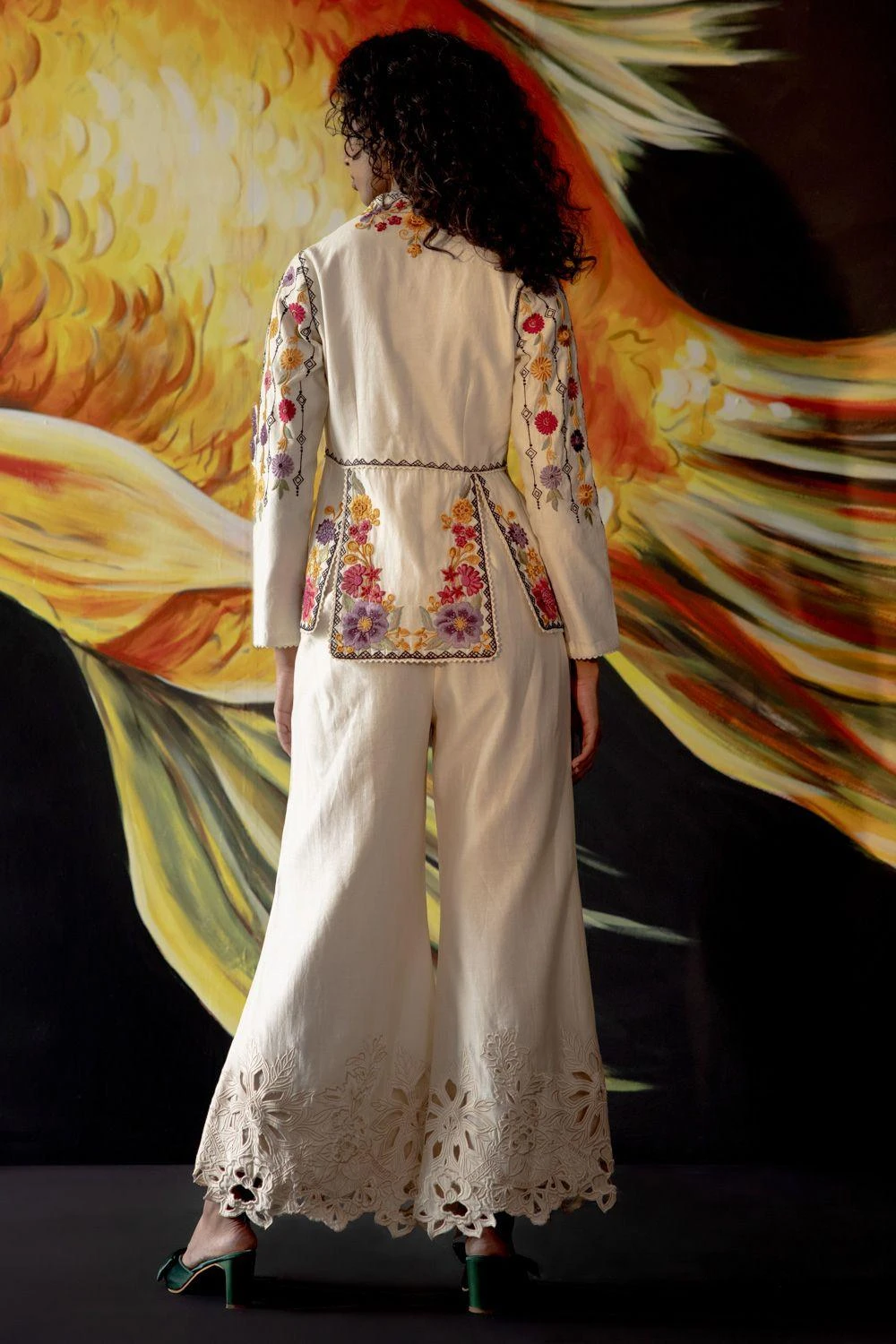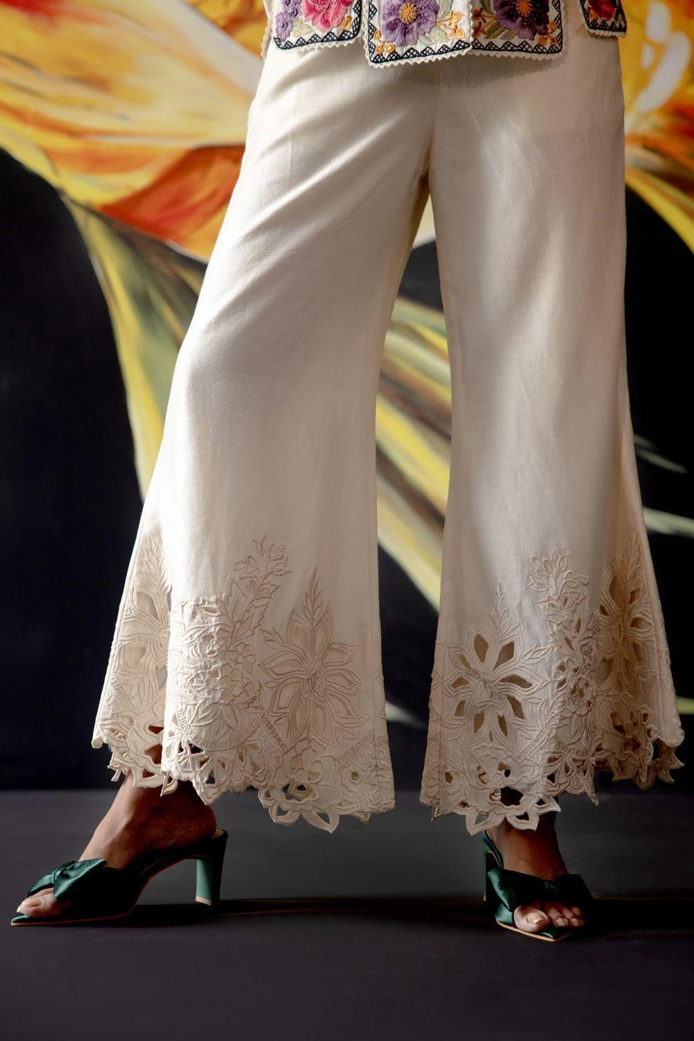 Maximise the life of your wardrobe with these exquisite pair of trousers. Crafted in chanderi, this bell bottom pant features a cutwork detail. Style it with a floral embroidered top and dainty jewellery to complete the look.