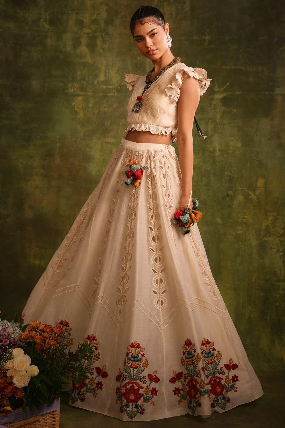 This ethereal ivory chanderi cutwork panel lehenga is perfect for daytime festivities. The floral beadwork details add a playful element to this dreamy piece.