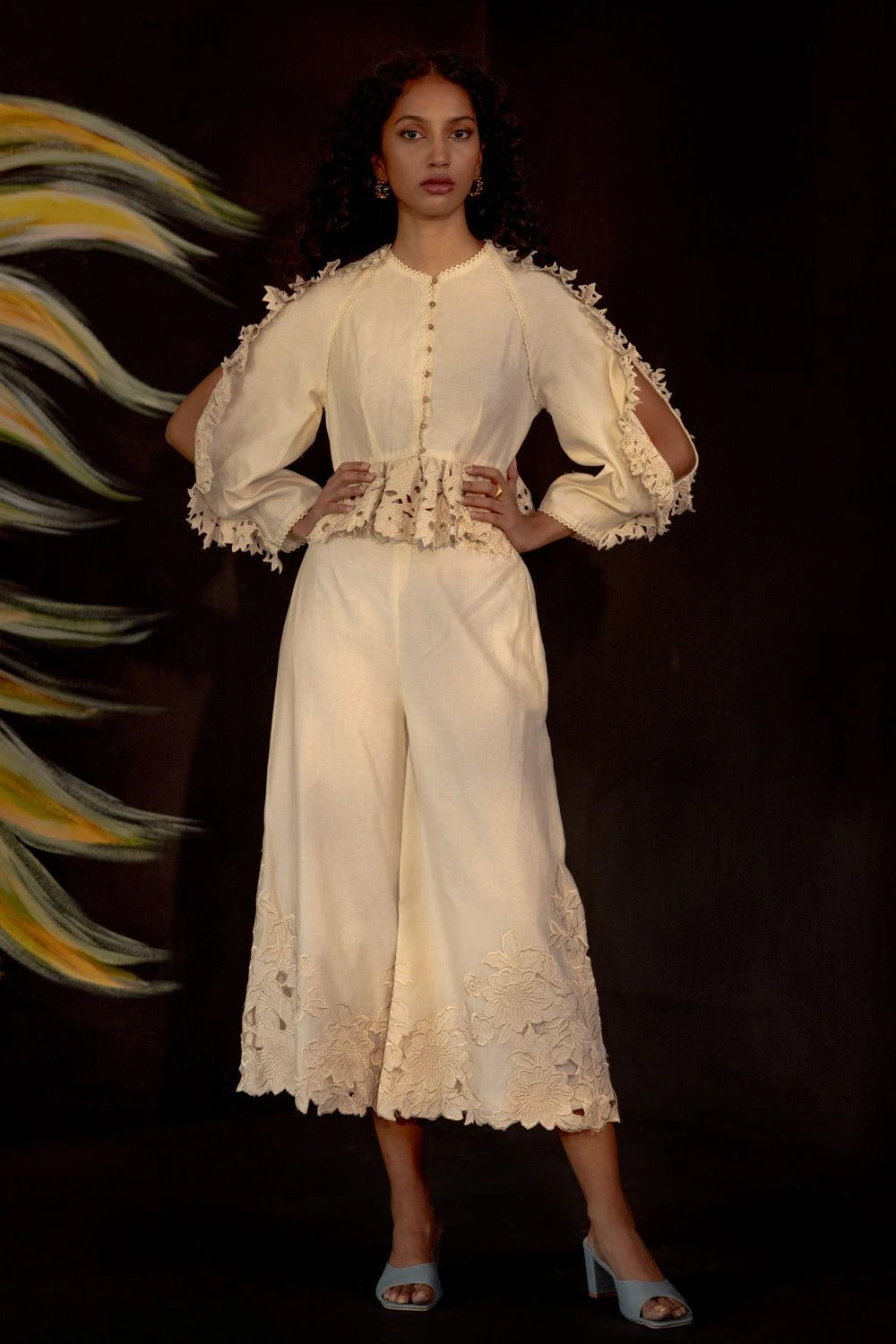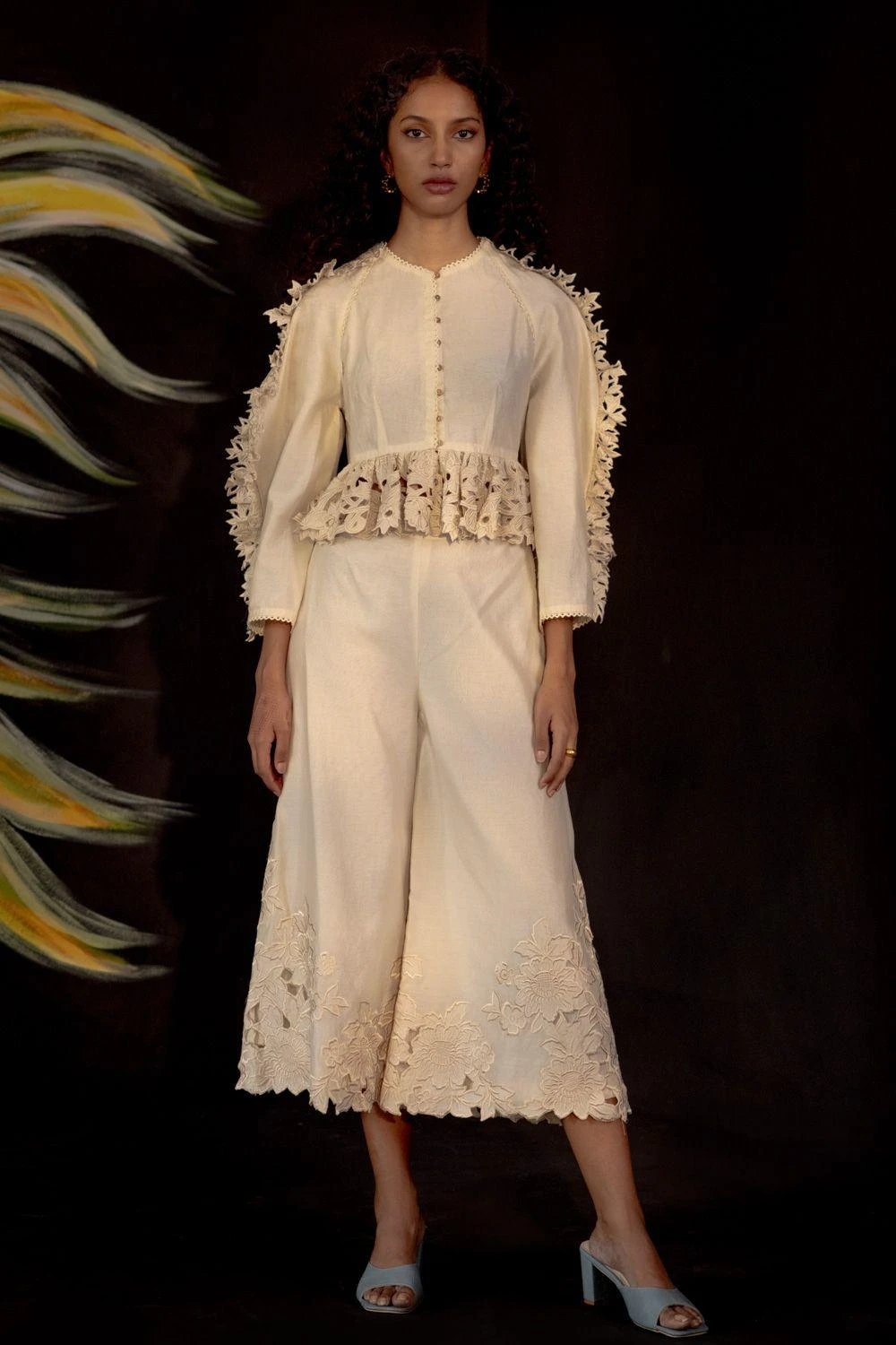The perfect amalgamation of style & comfort, this top is perfect for a day-to-night transition. Cut in chanderi, it features cutwork & a ruffle detail. Style this top with a pair of white straight fit trousers & dainty jewellery to complete the look.