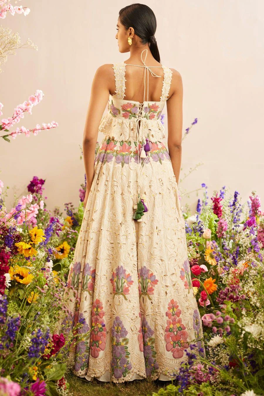 Maximise the life of your wardrobe with this bustier. Crafted in chanderi, this bustier features intricate beadwork details & ruffle sleeves. Pair it with the Ivory cutwork and beadwork lehenga from the collection for an effortless daytime look.
