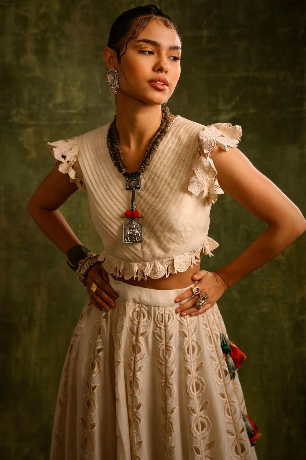 This playful ivory pleated top has delicate cutwork ruffles. This classic blouse can be styled with the matching lehenga for daytime festivities.