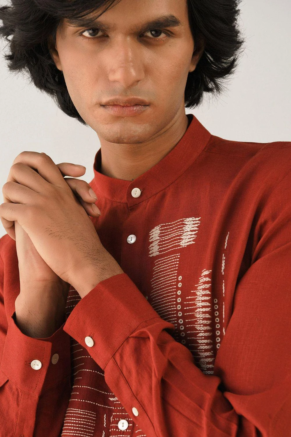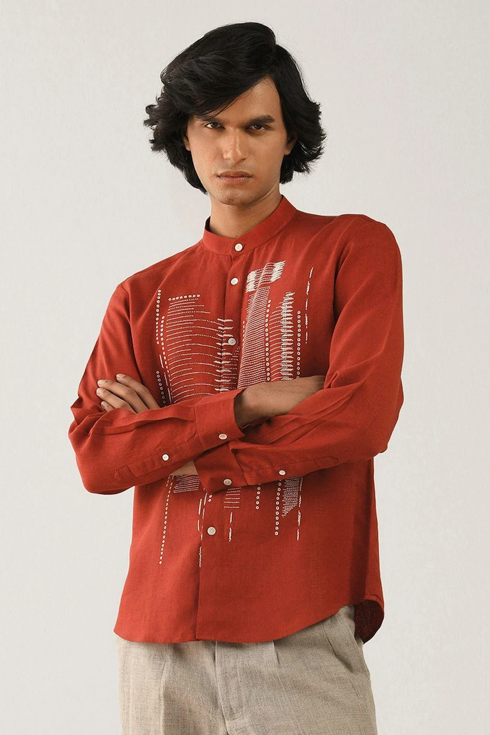Make your everyday wear stylish with this earth red abstract shirt. It is woven in linen and lifted with intricate hand embroidery in dots & dash arrangement. Style it with a pair of denims or beige pants.