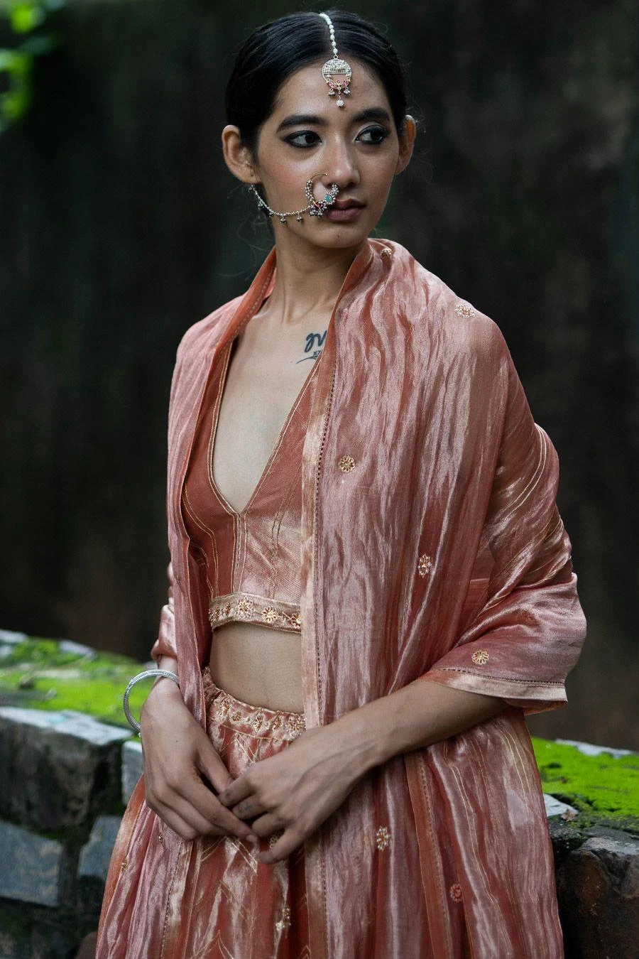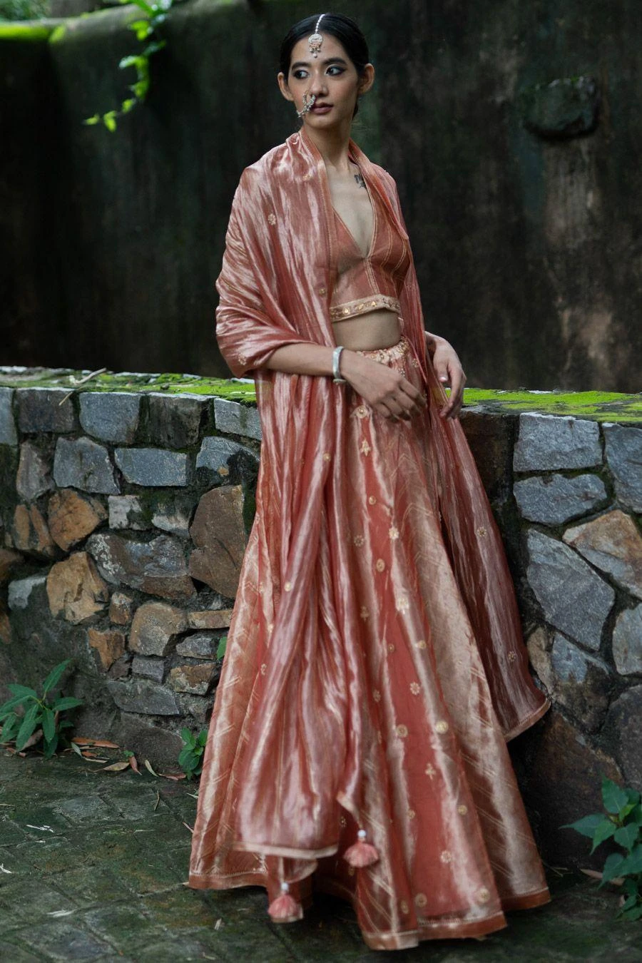 This pink lehenga set will see you through all kinds of celebrations this festive season. Crafted in tissue silk, this set comes with a zardosi & aari embroidered lehenga paired with a hand embroidered blouse & dupatta.