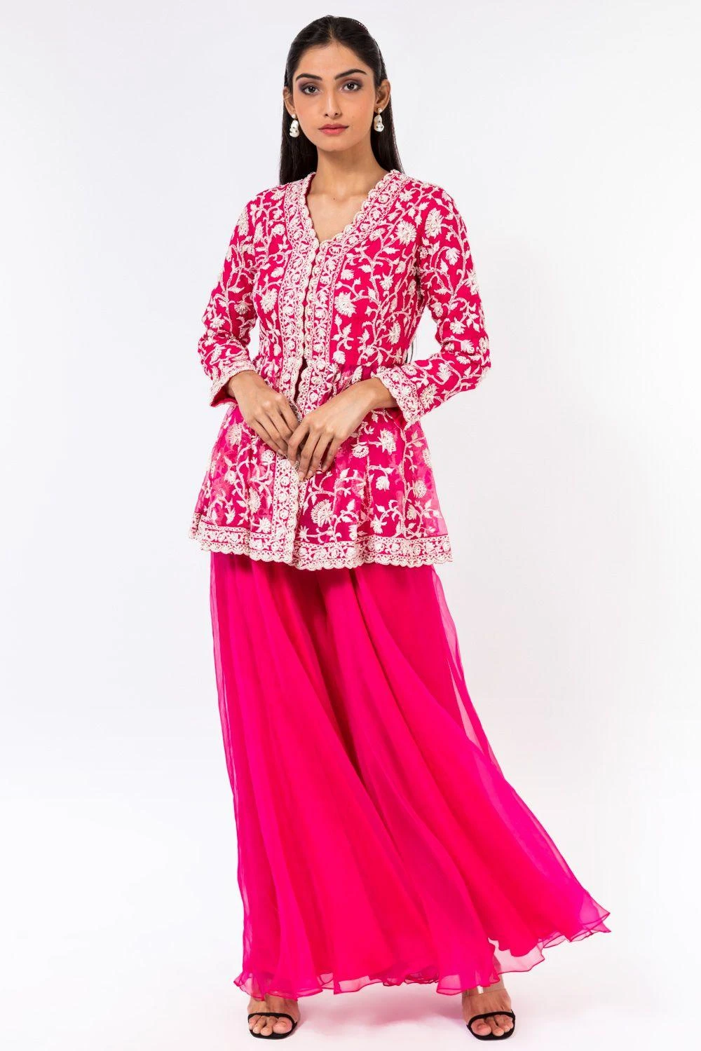 It’s all about sharara sets this season, and what better than in a combination of ecelctic palette and charming silhouette. This pink sharara set features a V neck embroidered jacket & a pair of voluminous sharara pants.
