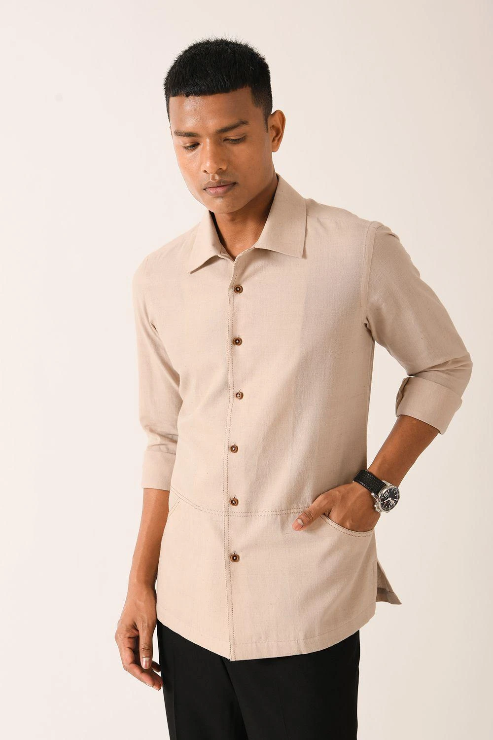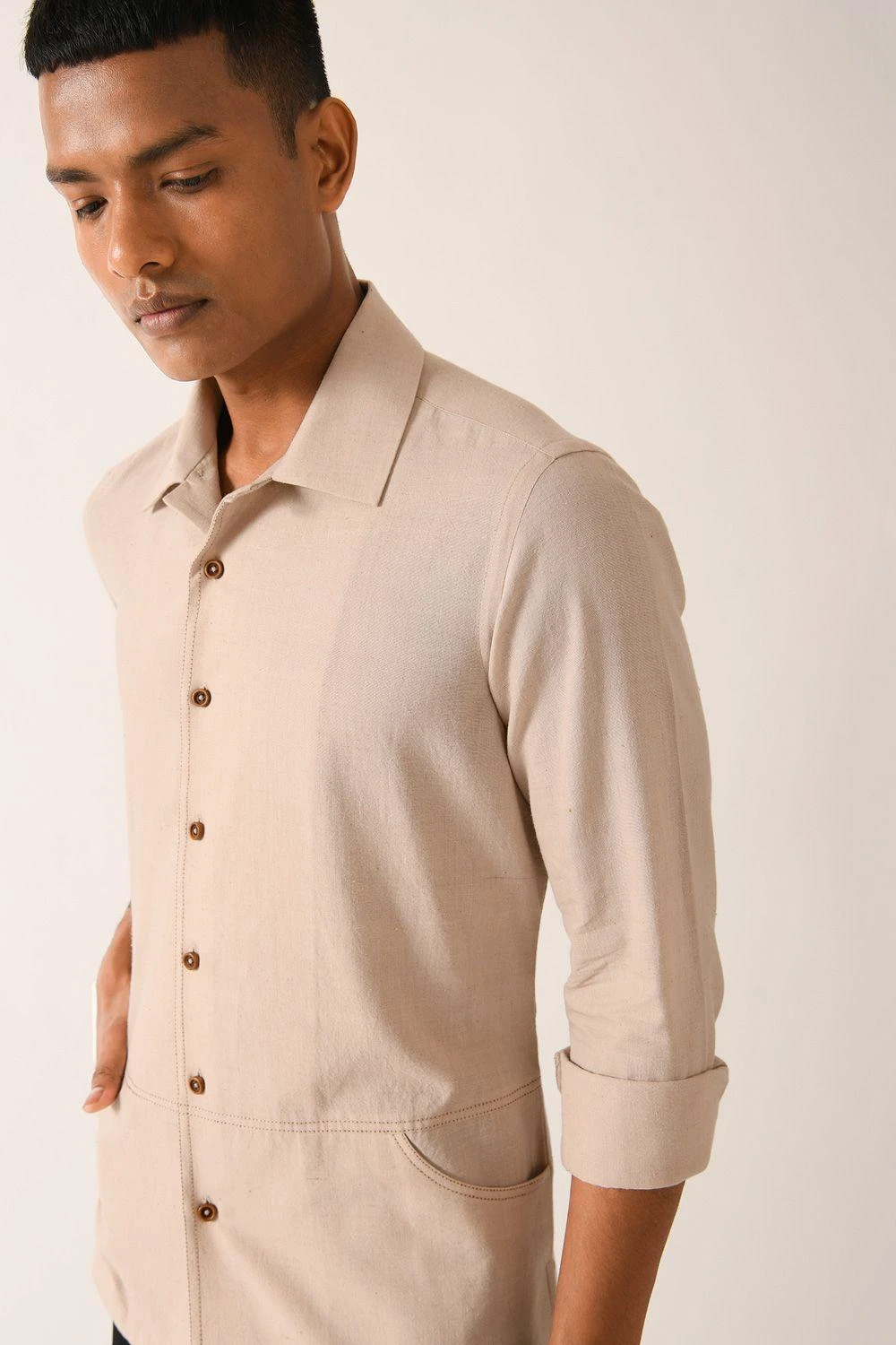This classic sandstone shirt can be worn from day to evening effortlessly. It is cut in handloom cotton with stitch lines and features two side pockets, adding character to this piece.