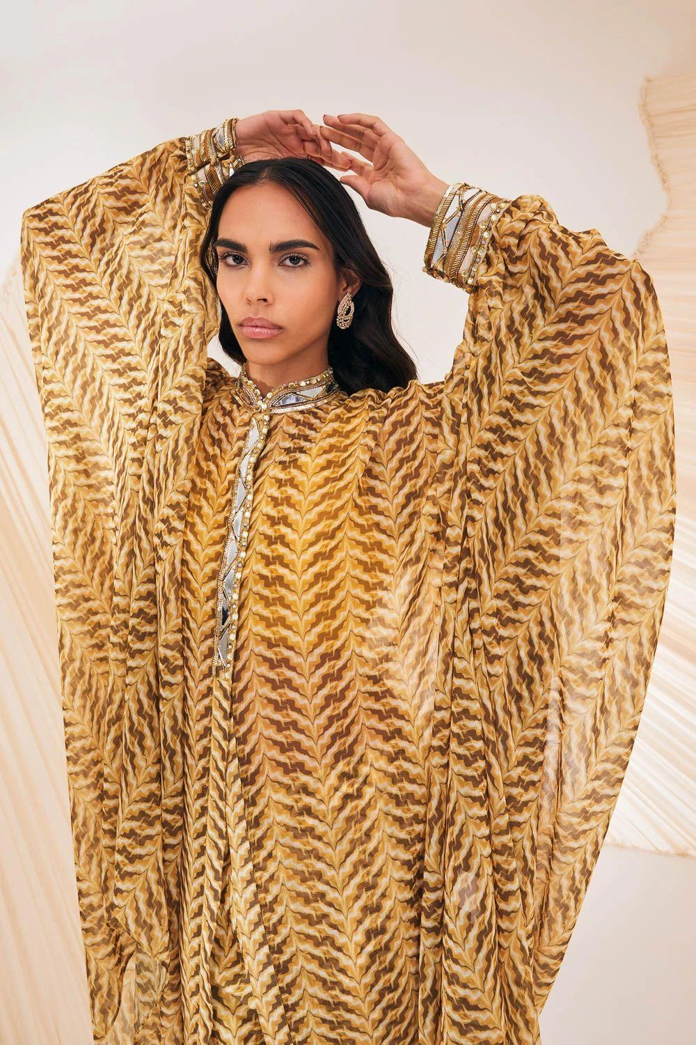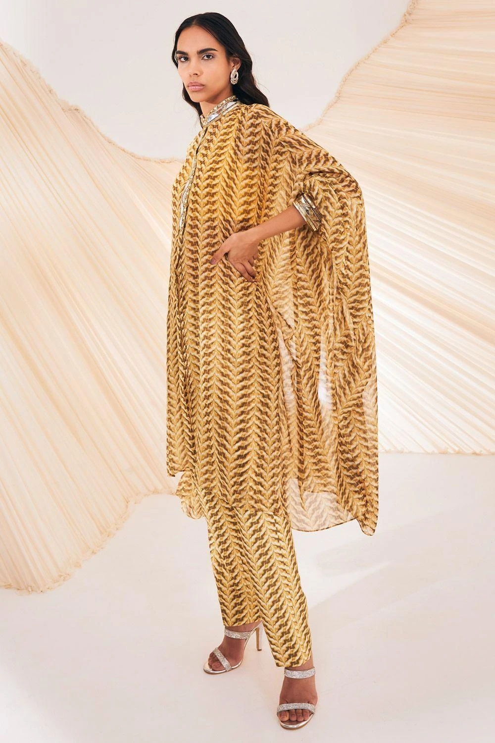 This kaftan set will see you through all kinds of celebrations this festive season. Crafted in chiffon, this set features a mirrorwork, pintucked kaftan paired with coordinating pants & a bustier. Add a pair of dangler earrings to complete the look.