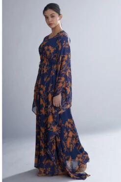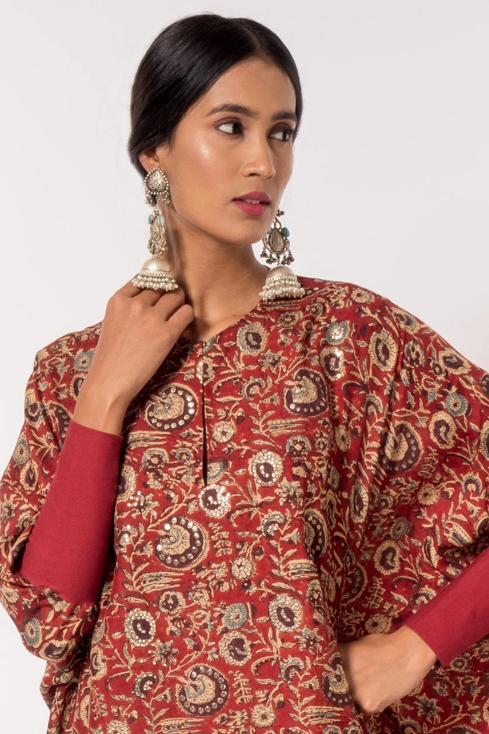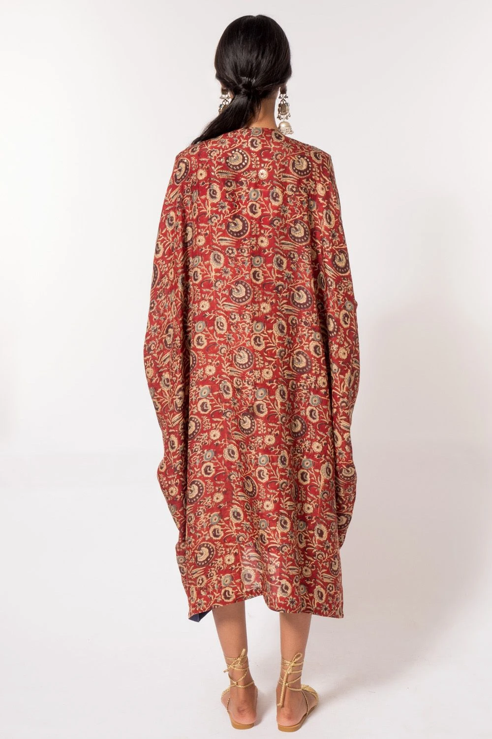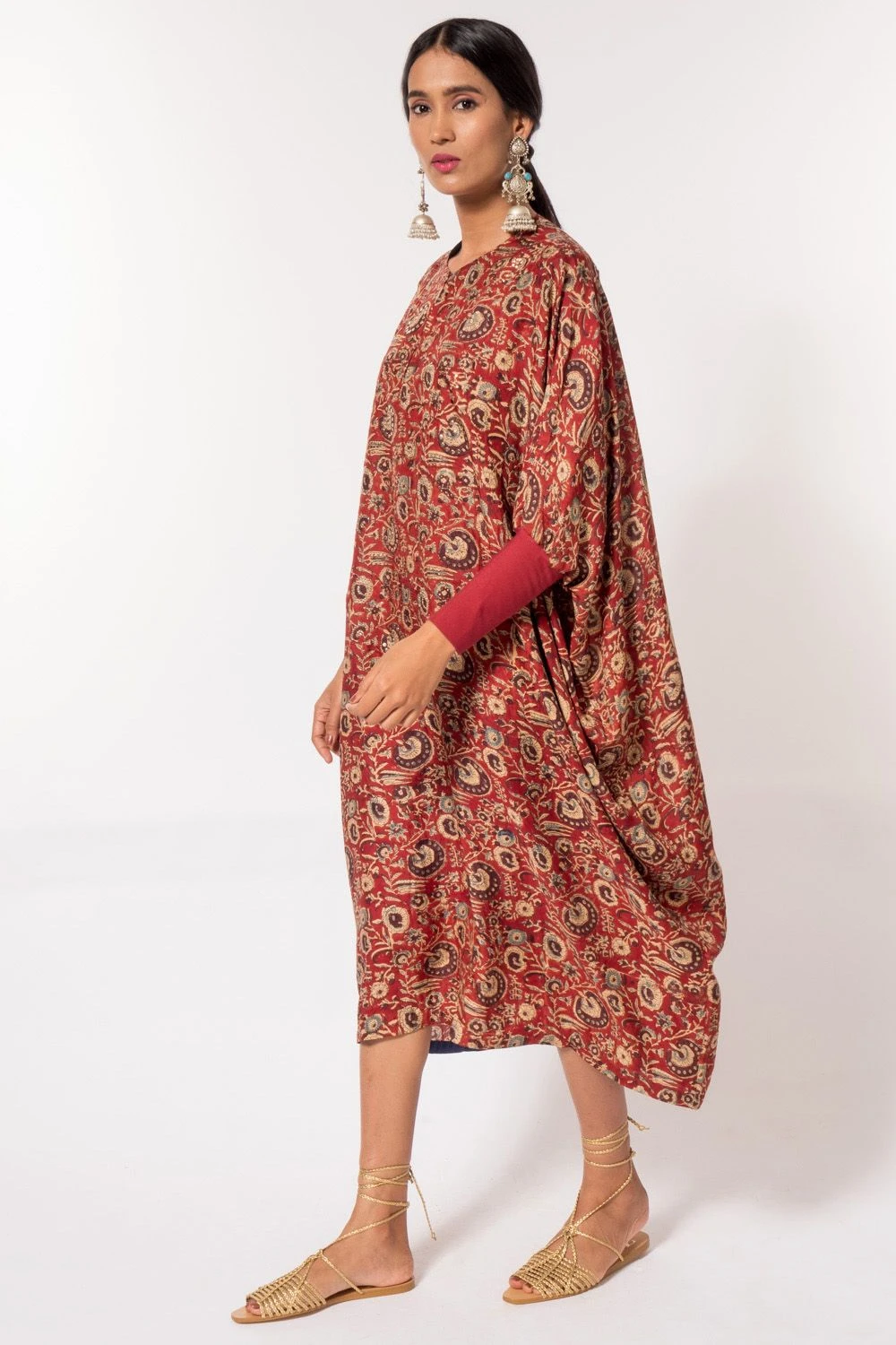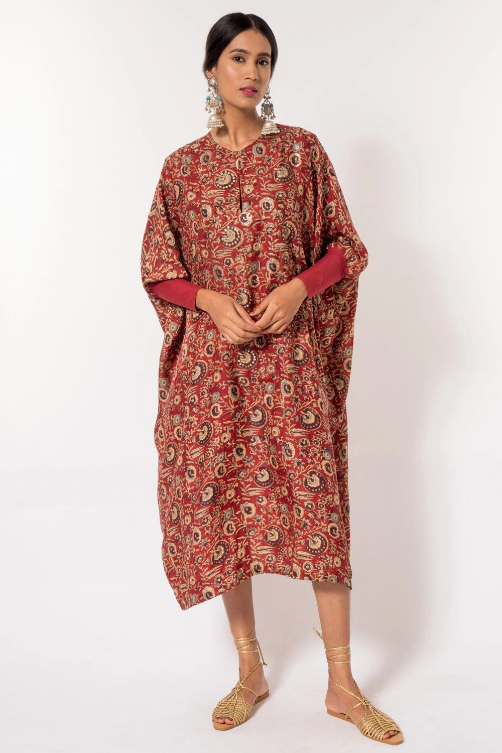 For a girls outing or an intimate occasion, this red kaftan has got you covered. It is cut in naturally dyed silk fabric with hand block prints and features mukaish work that adds a subtle shimmer. You can style it with a statement boho clutch.