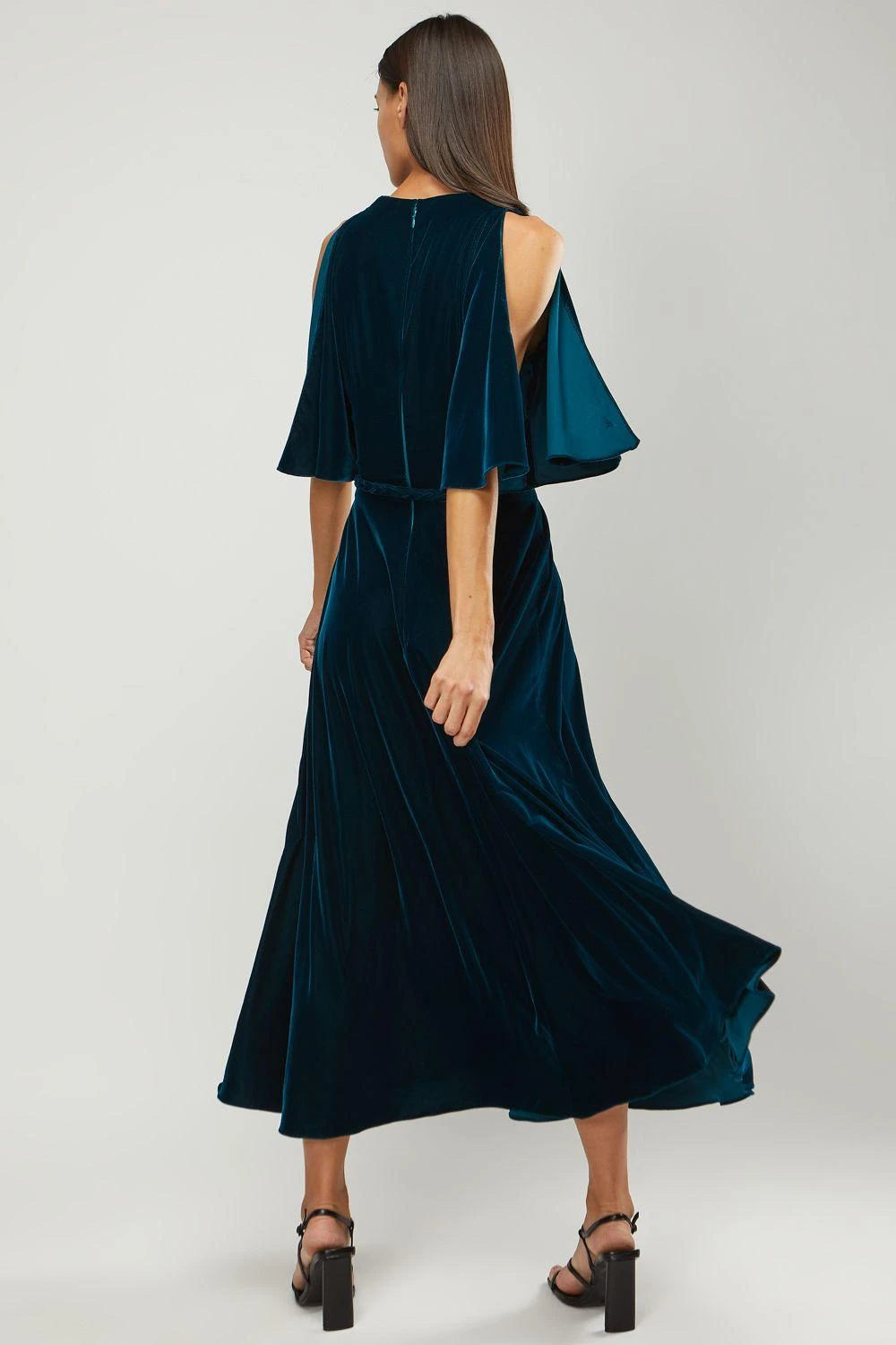 You can count on Gauri & Nainika’s emerald green velvet midi dress for the best in minimalist eveningwear that feels sleek & modern. Crafted in velvet, this dress features a halter neck, flutter sleeves & a braided belt.