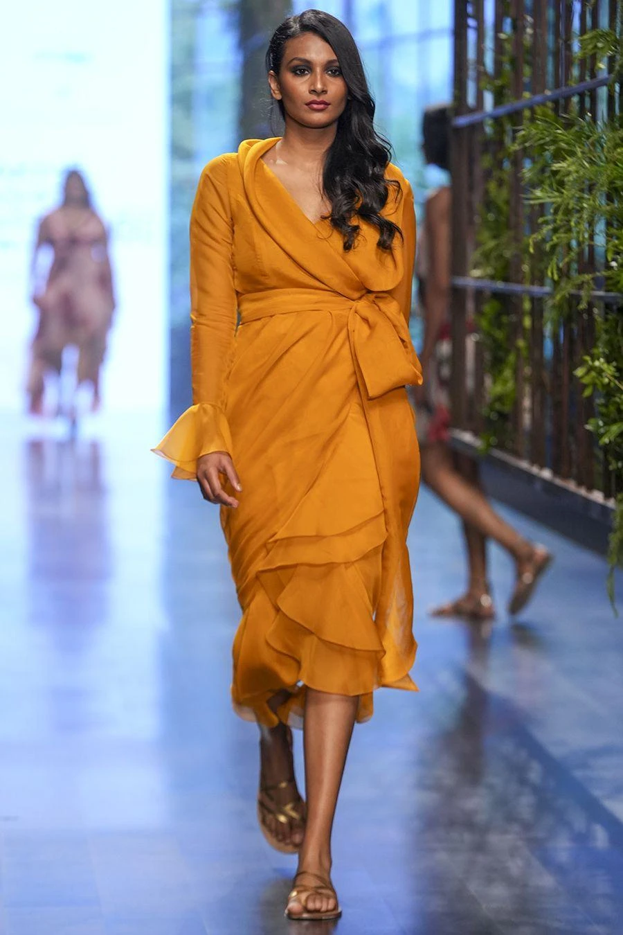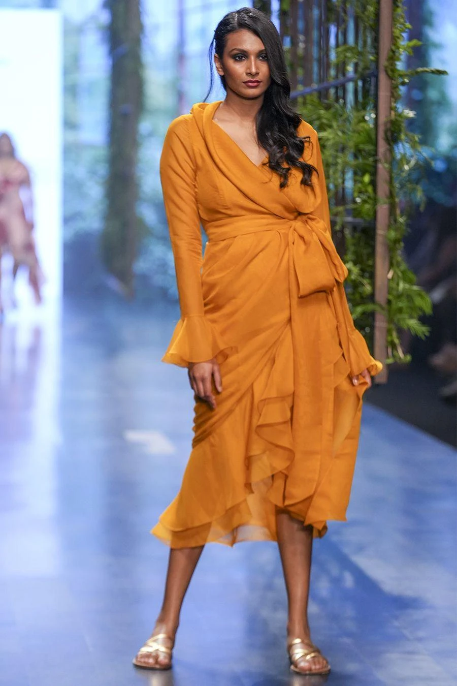 This dress hits all the style points for a perfect evening dress. This full sleeve wrap dress features a shawl collar and a ruffle detail. Style it with a pair of statement earrings & heels to complete the look.